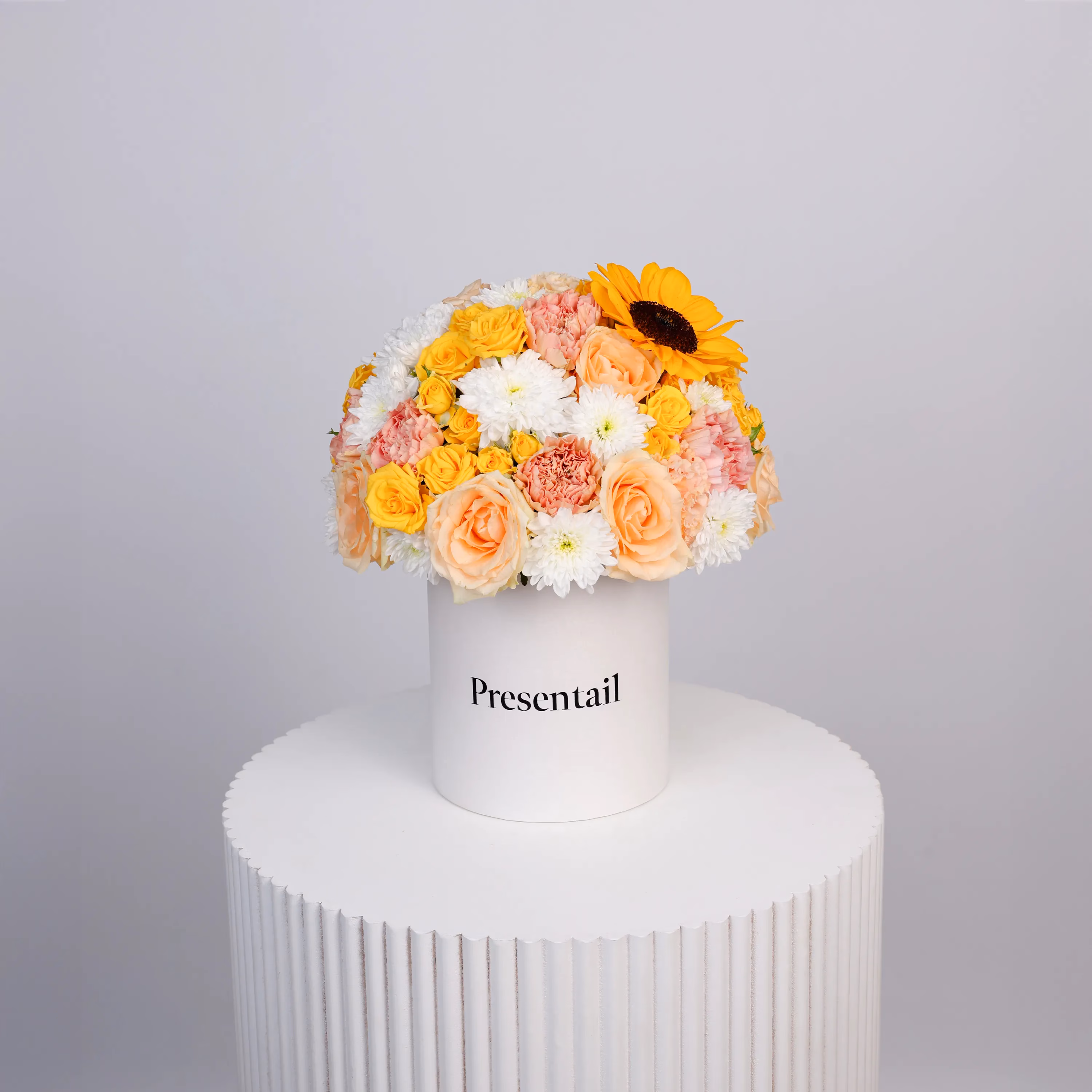 صندوق أوميغا عبارة عن صندوق زهور جديد مصنوع من ورود الخوخ والورود الحلوة والبابونج وغيرها.