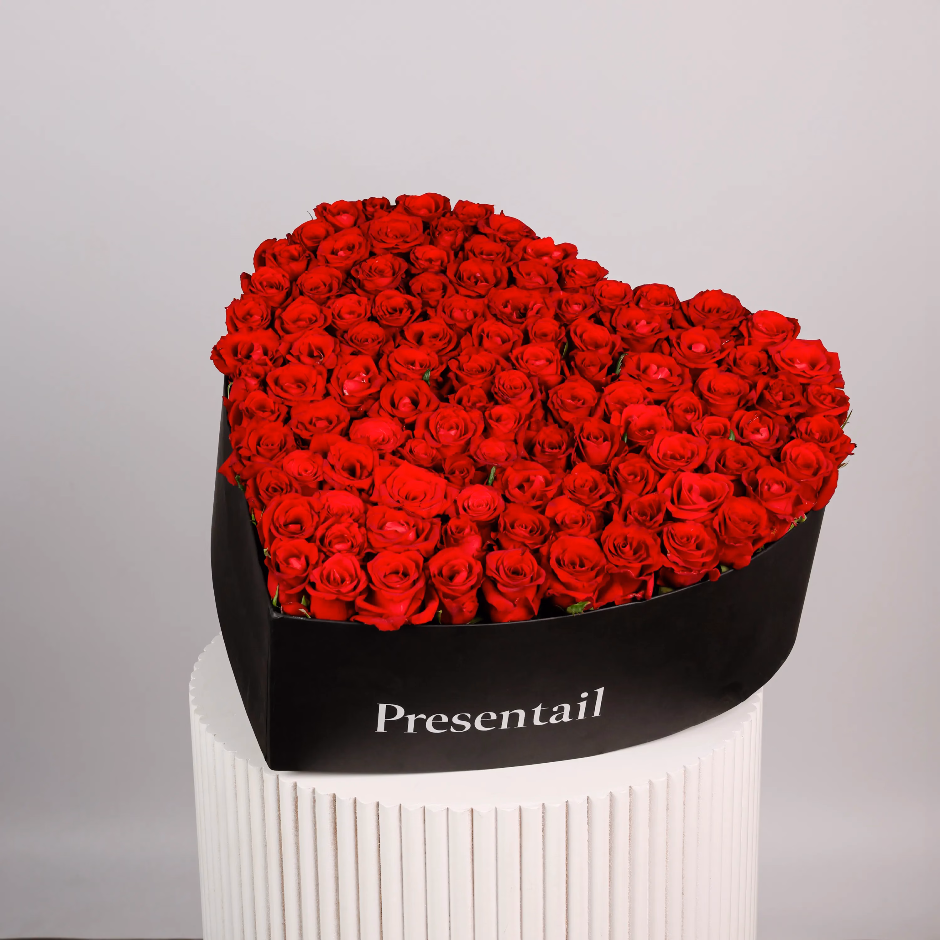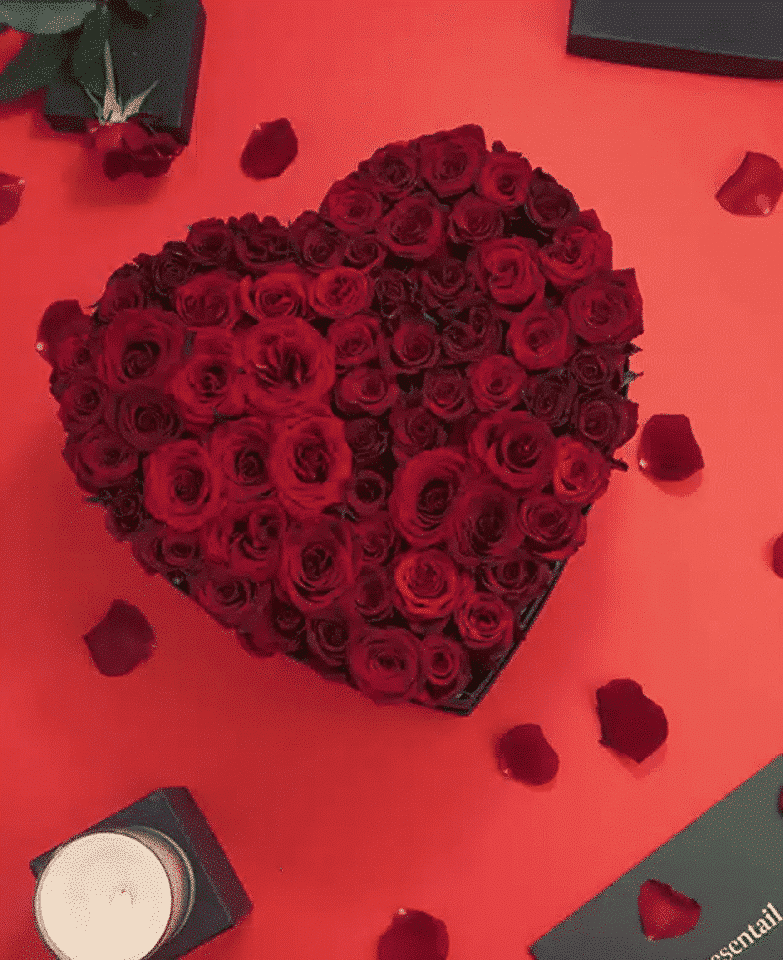 يتألف صندوق القلب الأحمر الكبير من ورود حمراء مجمعة معًا في صندوق على شكل قلب لتعبّر عن حزمة من الورود الحمراء.