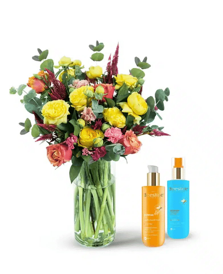 Bel Air is a beautiful flower vase accompanied by Tanning Oil and After Sun spray.