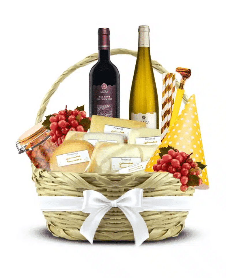 The Cheese and Wine: NYE edition, a basket full of cheese, two bottles of red and white wine, stuffed Santa, and jar of ginger bread.