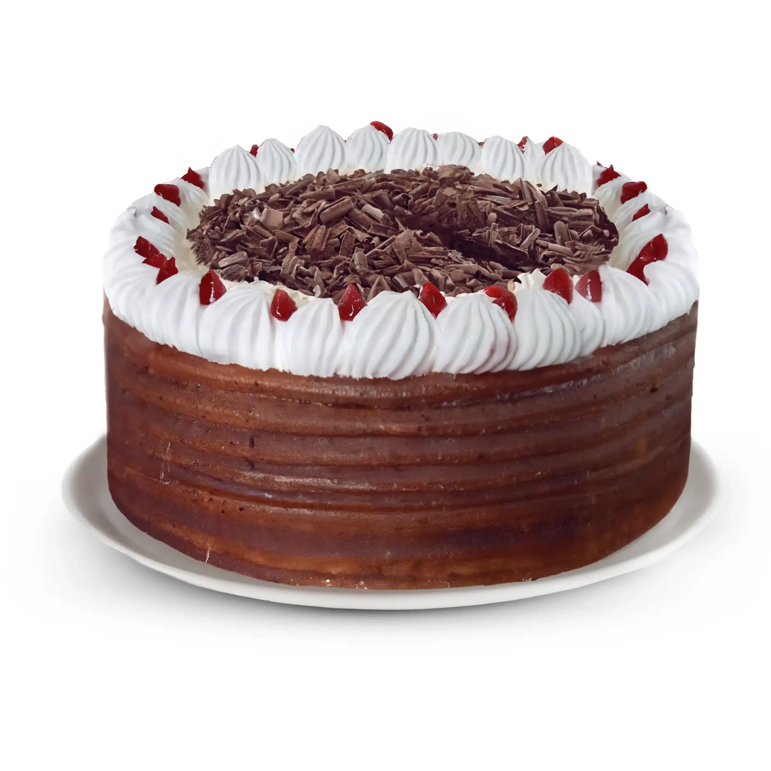 The Choco Fraisier Cake is filled with layers of chocolate cream & strawberry sauce, topped with white chocolate swirls. Serves 8-10 people.
