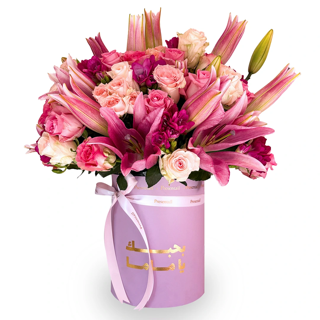This flower box brings together the elegance of pink roses, the vibrancy of chrysanthemums, the delicate charm of baby roses, and the soft wispiness of heather.