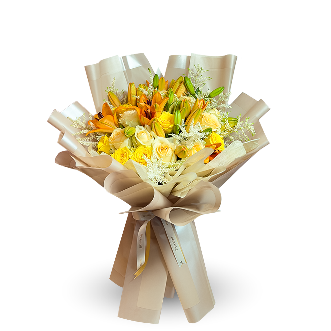 A beautiful yellow bouquet that includes: 7 yellow roses, 7 peach roses, 5 orange lilium stems and half pack astilbe.