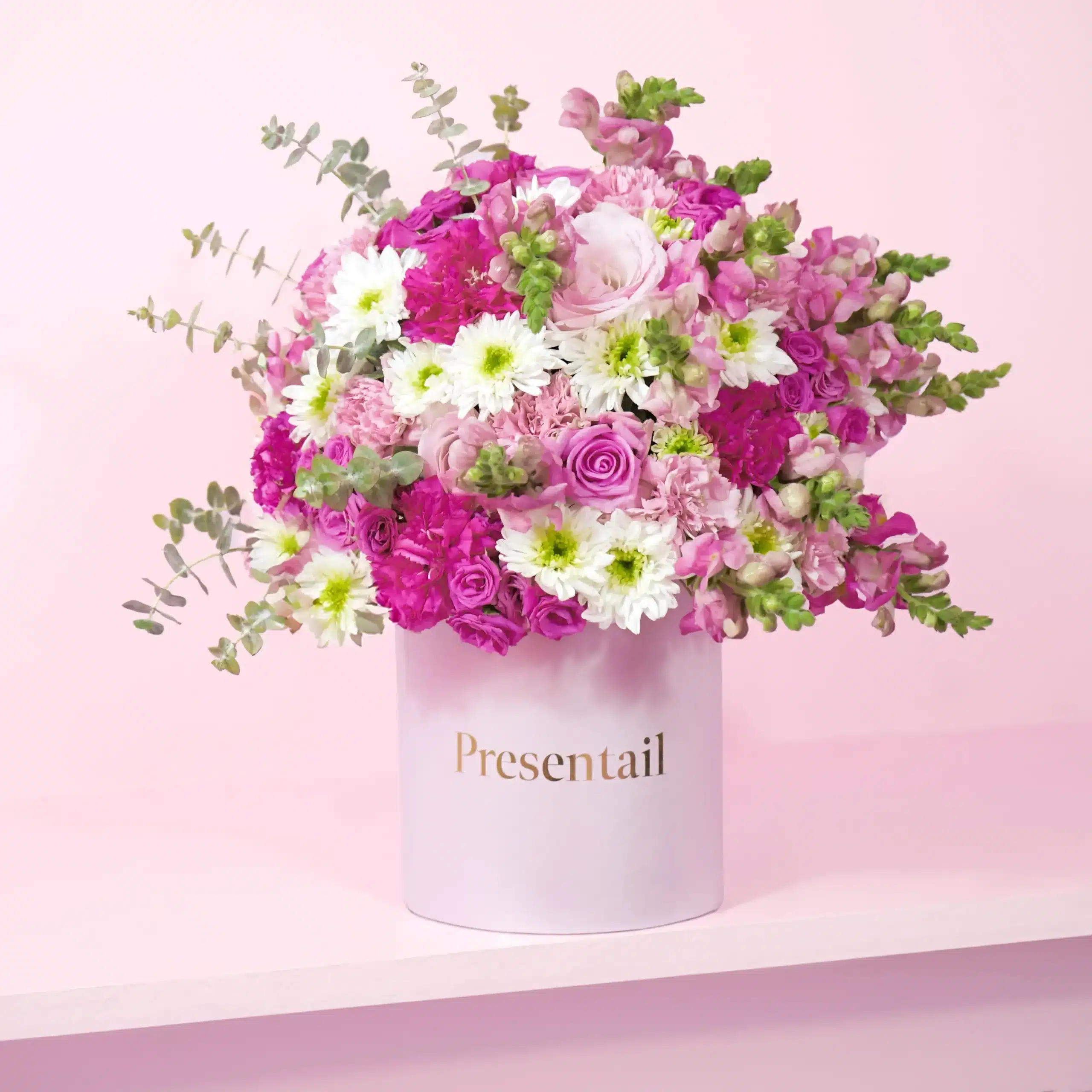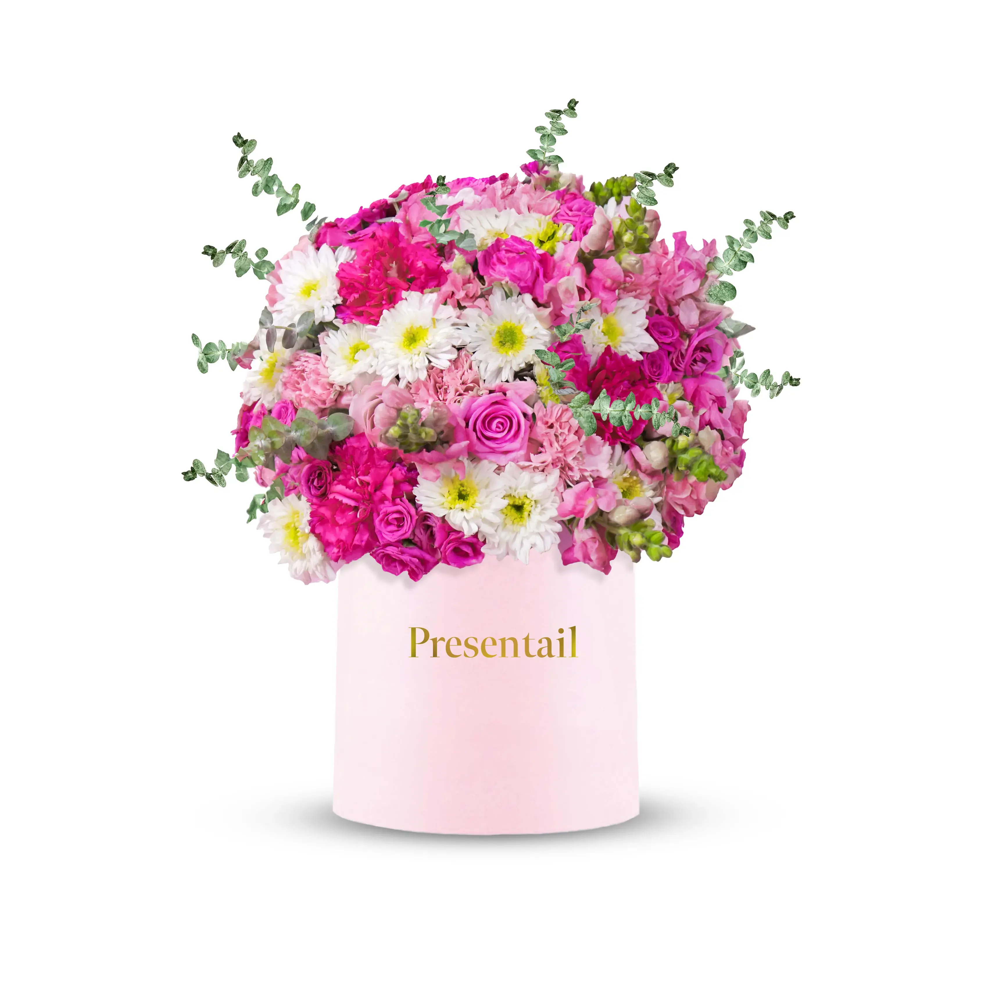 The Flower Phantasia is a cute large sized box of mixed flowers with greenery. Match your flowers with a box color to create the cutest flower gifts.