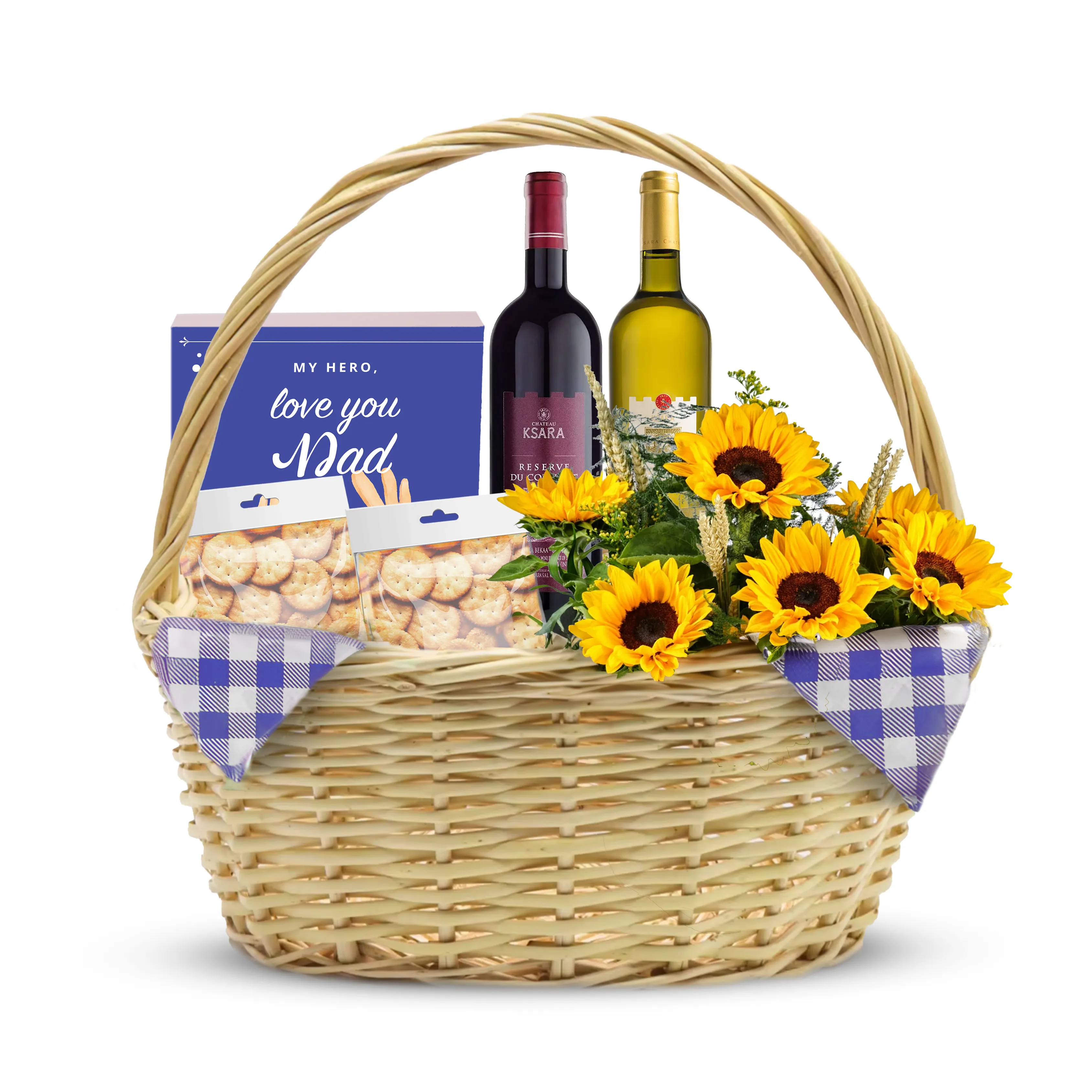 Celebrate your sophisticated dad with the Gentlemen’s Indulgence Basket. This elegant assortment includes top-shelf spirits, decadent chocolates, and a beautiful arrangement of flowers, making it the perfect gift for the refined gentleman, along with a bottle of Ksara red wine and white wine