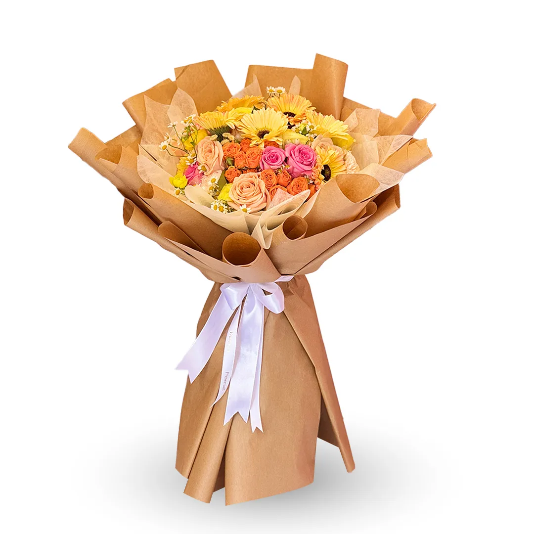 The Golden Grace is a yellow flower bouquet made of peach roses, sweet roses, roses, carnations, and more types of flowers