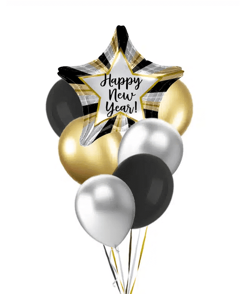 Happy New Year Bundle! is a balloon bundle, including a set of 6 round balloons and an 18 inch foil balloon. All are helium filled.