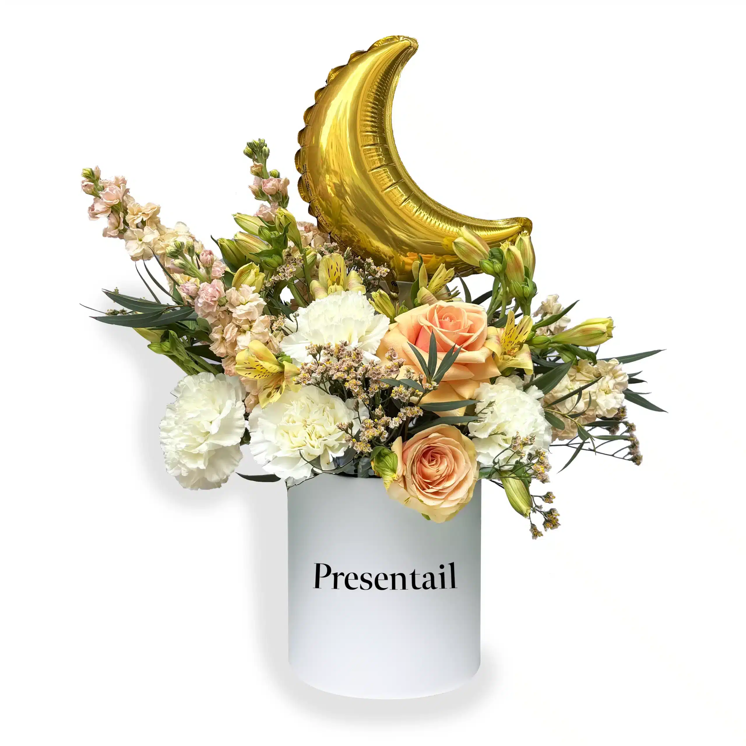 Hymns of Gratitude is a large flower box made with 2 peach roses, white Qronfla, peach Statice, Peach Matthiola and an air filled foil gold moon balloon.