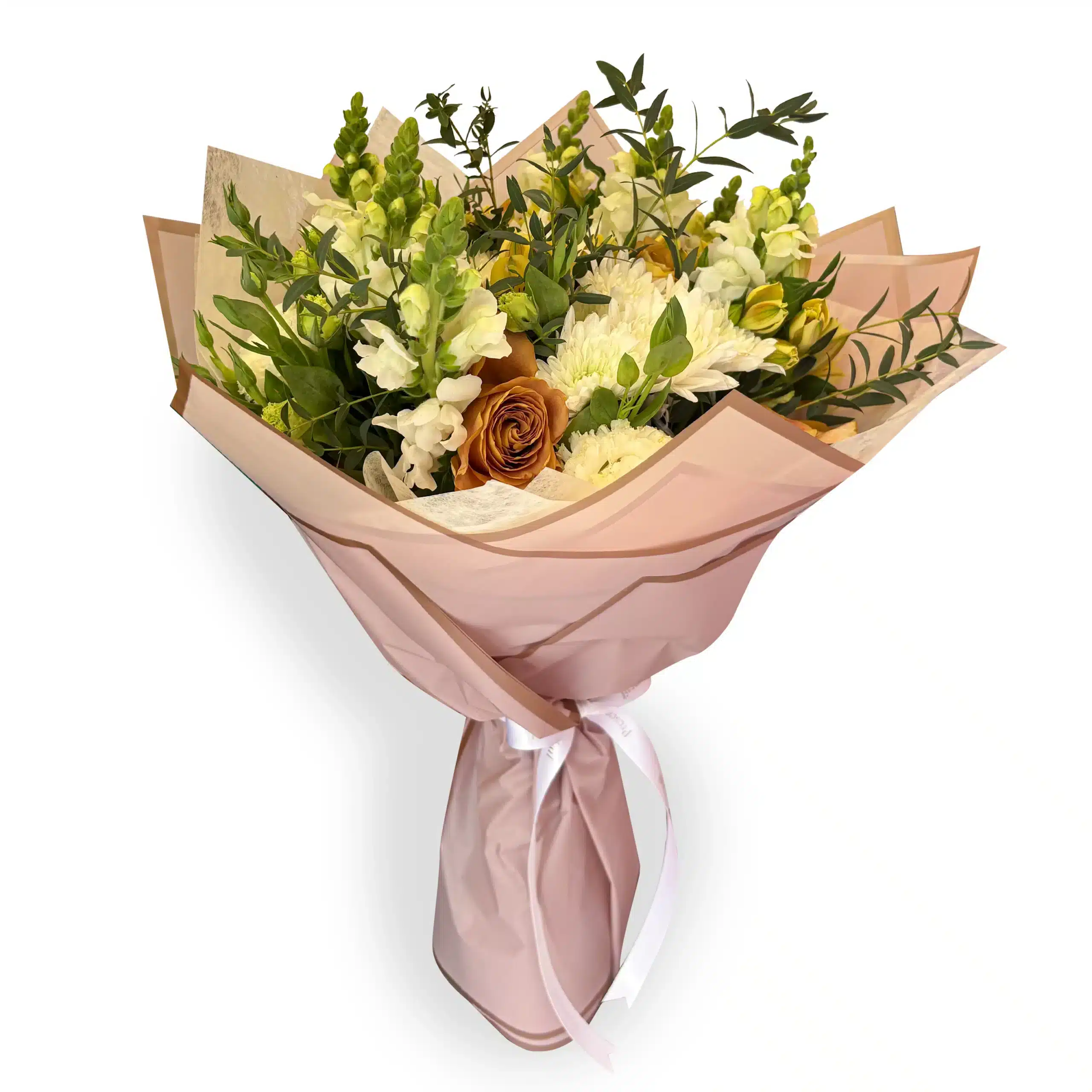 Lantern Light Florals is flower bouquet made with orange roses, white chrysanthemum, white matthiola and eucalyptus.