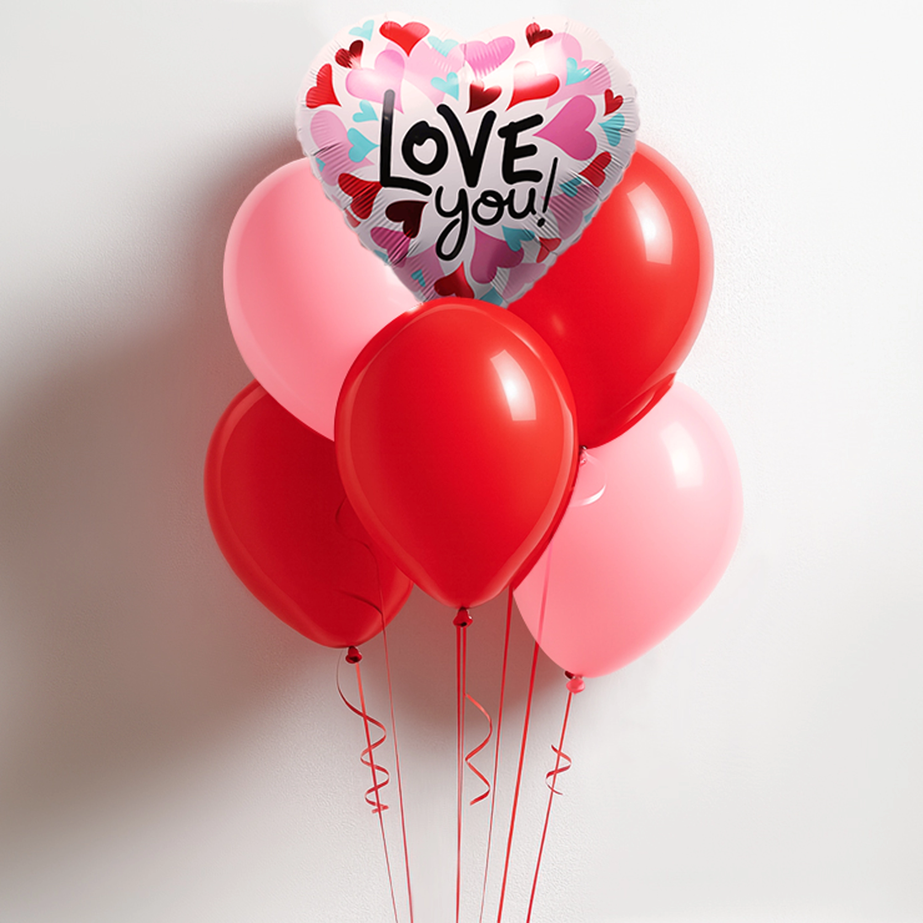 Love You Balloon Bundle includes: One I Love You, 16 inch foil balloon, and six 12-inch latex balloons. All are helium-filled