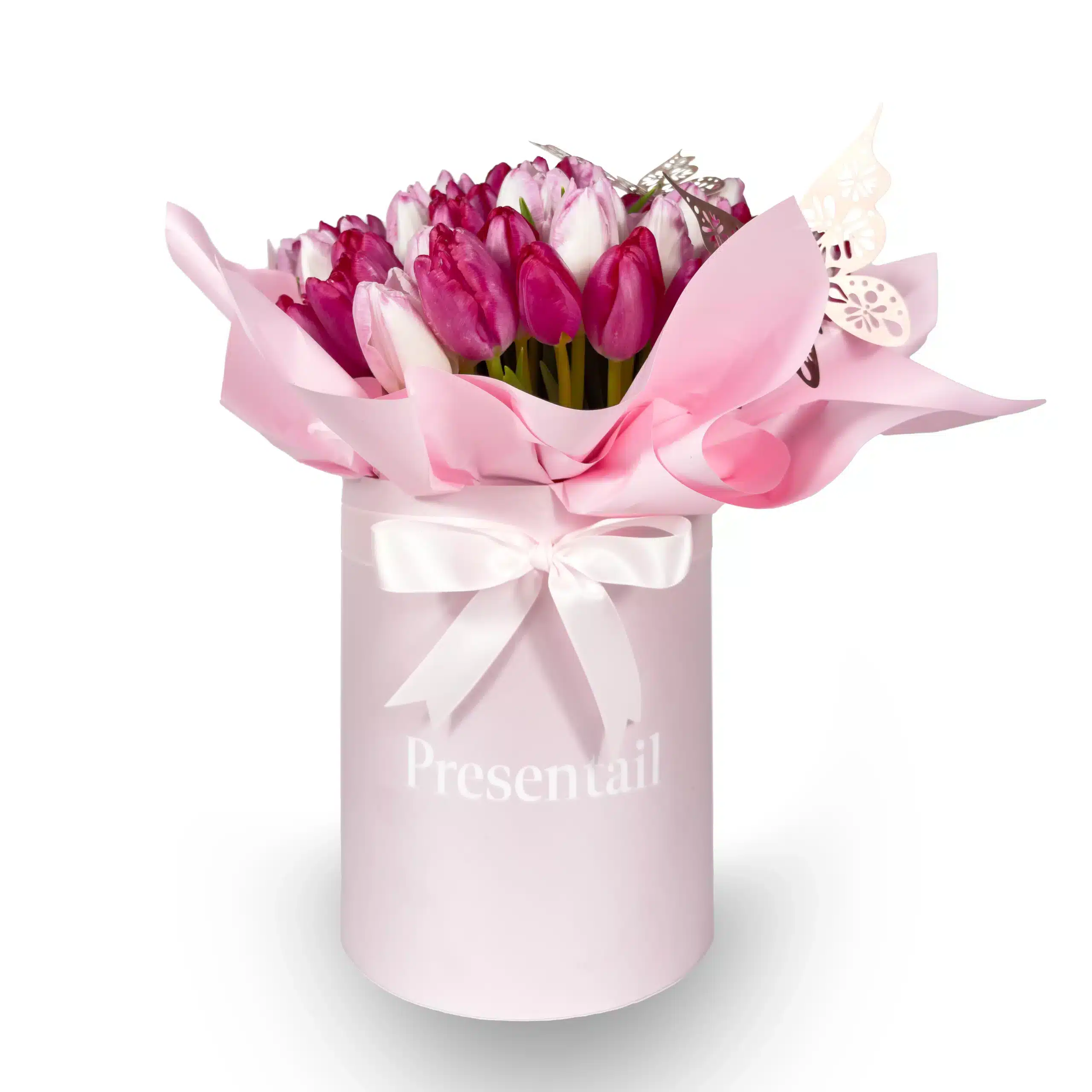 Mom’s Bloom, A special large flower box with pink tulips.