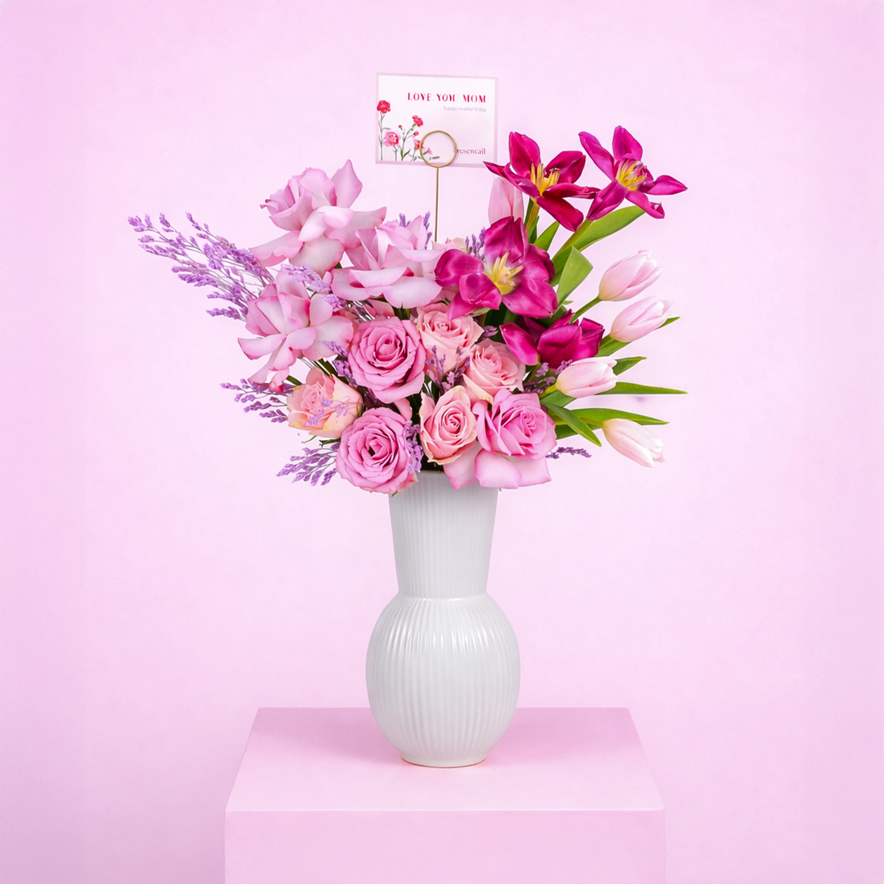 A delicate vase arrangement blending roses and tulips in romantic shades for Mom.