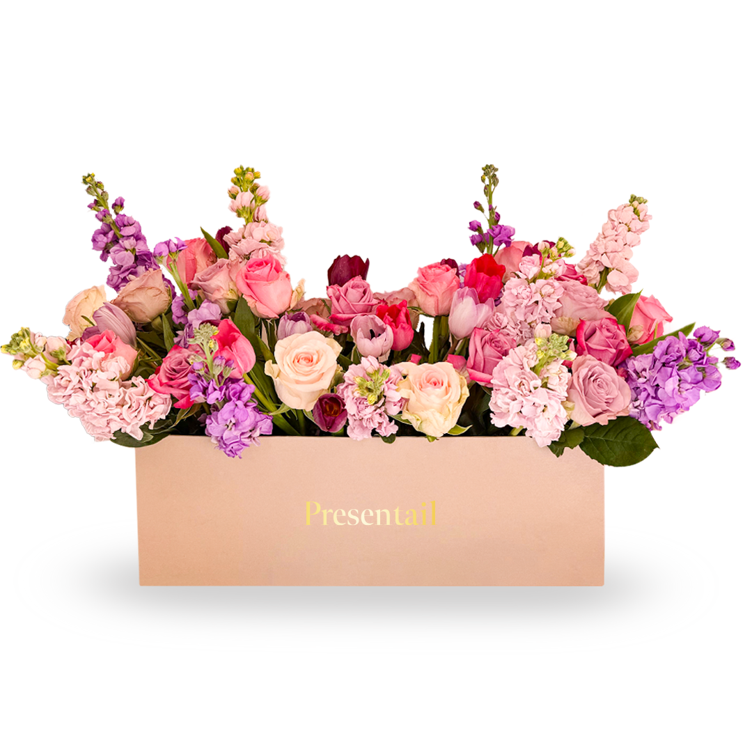 A symphony of blushing pinks! This exquisite flower box overflows with the soft beauty of pink roses, graceful pink tulips, dainty kalanchoe blooms, a plump hydrangea pot, and the delicate elegance of eustoma. A perfect gift for someone with a tender heart.