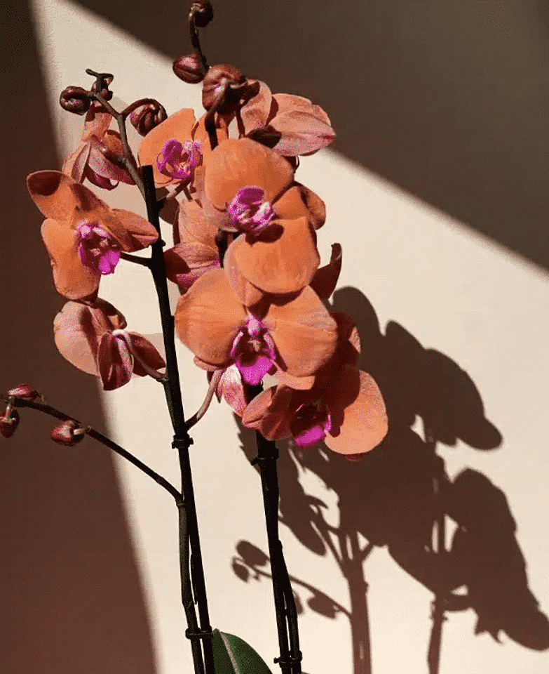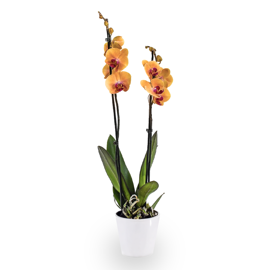 2 Stem orange orchids in a pot.