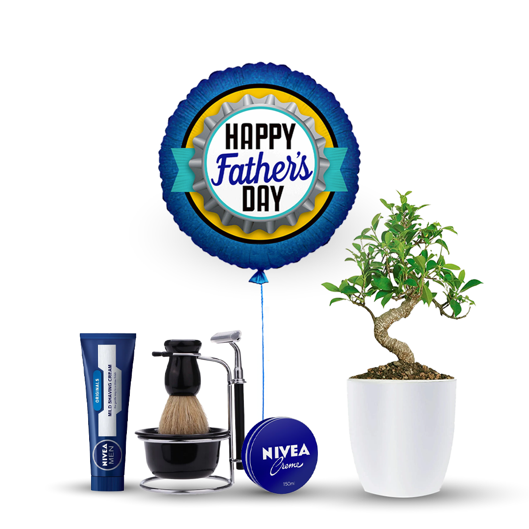 This bundle includes the dad care set with a bonsai plant and happy father’s day balloon