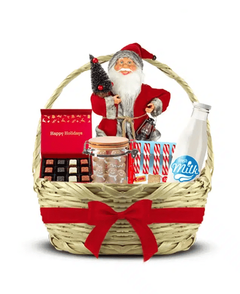 Panier De Noel is a seasonal basket, consisting of a large jar full of ginger bread, medium box of chocolate a bottle of milk, Santa figure, and some candy canes.