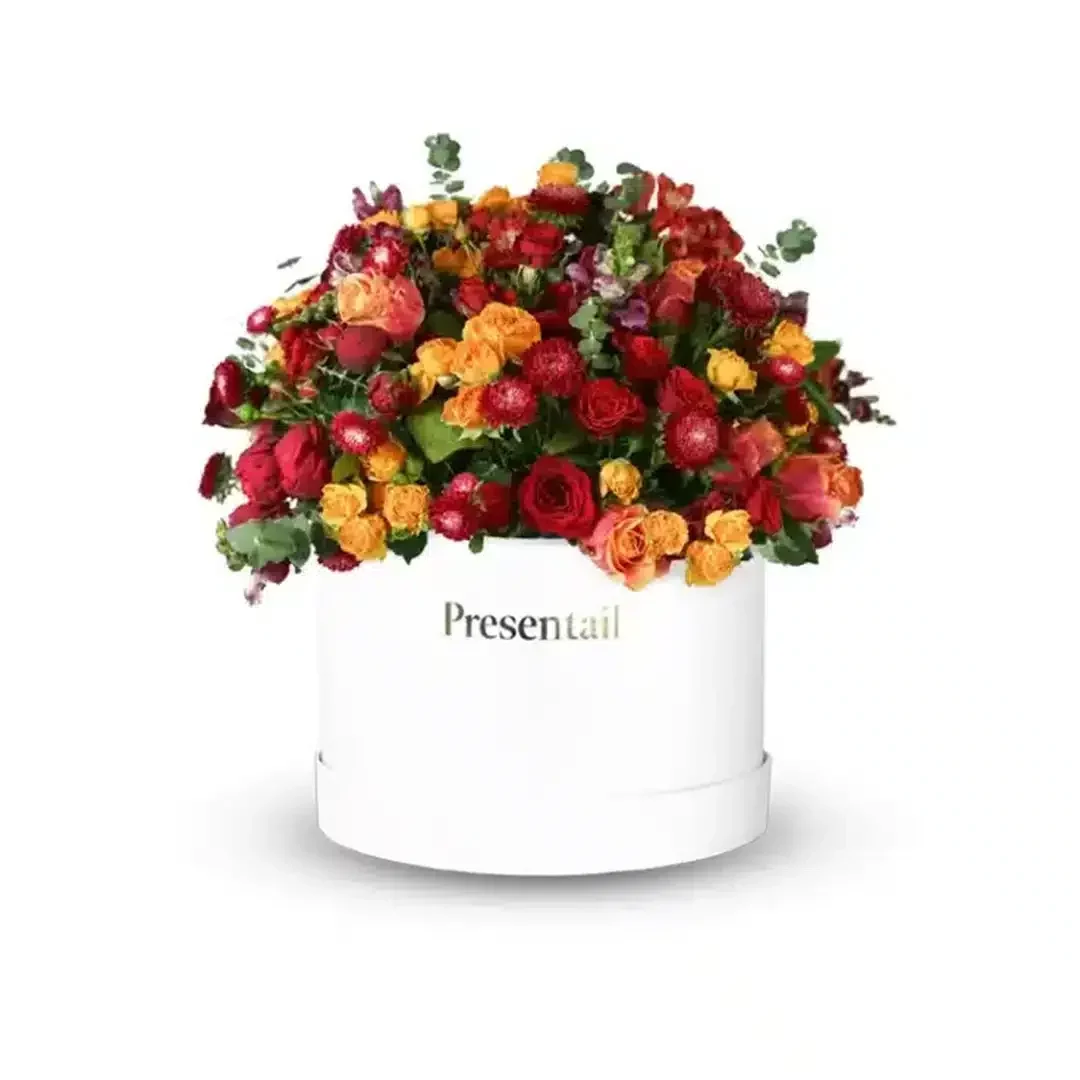 This box contains 2 packs baby rose, 10 red roses, 1 pack red chrysantheumum, half pack eucalyptos, 1 pack statice, 15 orange roses.
