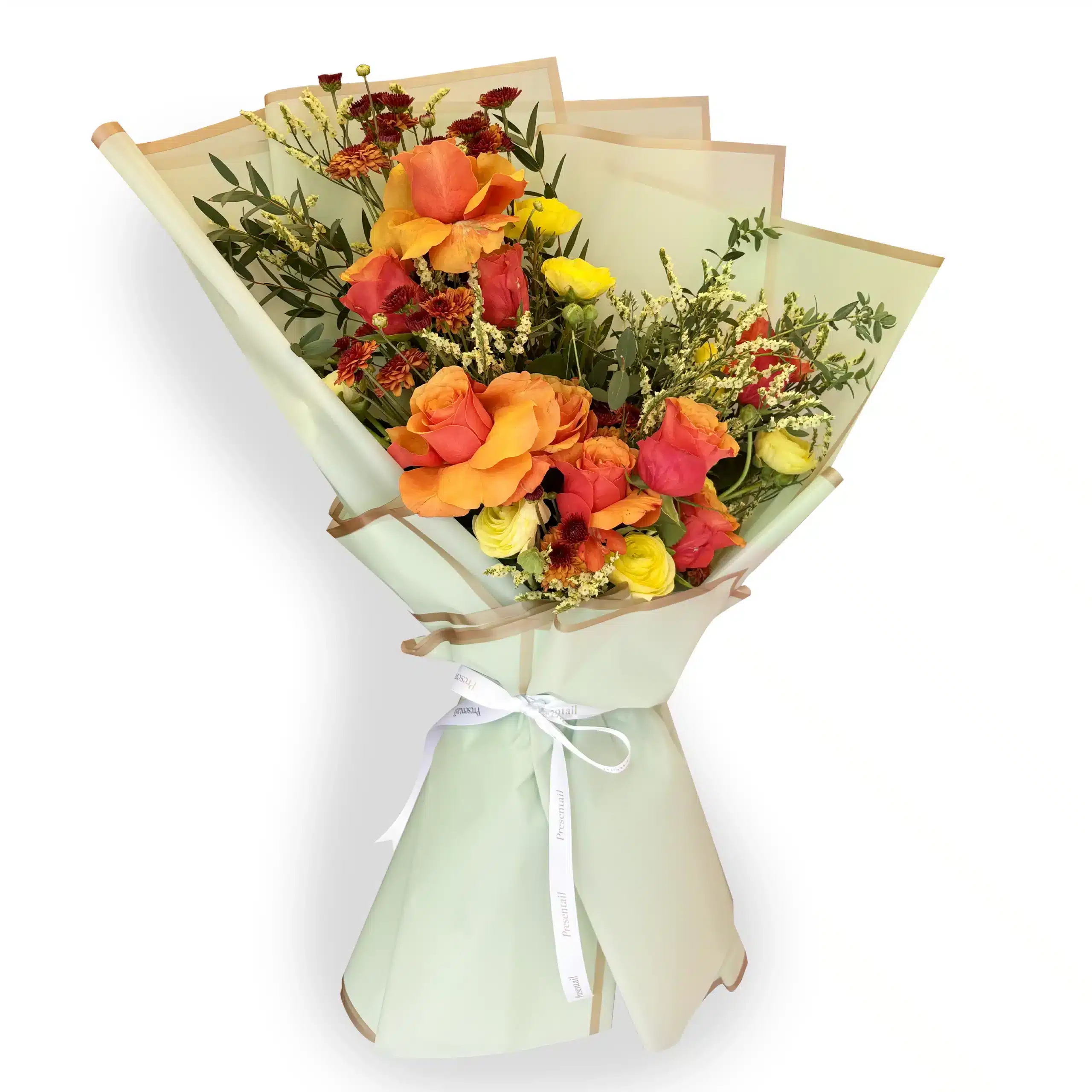 Reconciliation is a flower bouquet made especially for this eid with 10 cherry brandy roses, orange chrysanthemum, yellow relankil, white statice and eucalyptus.