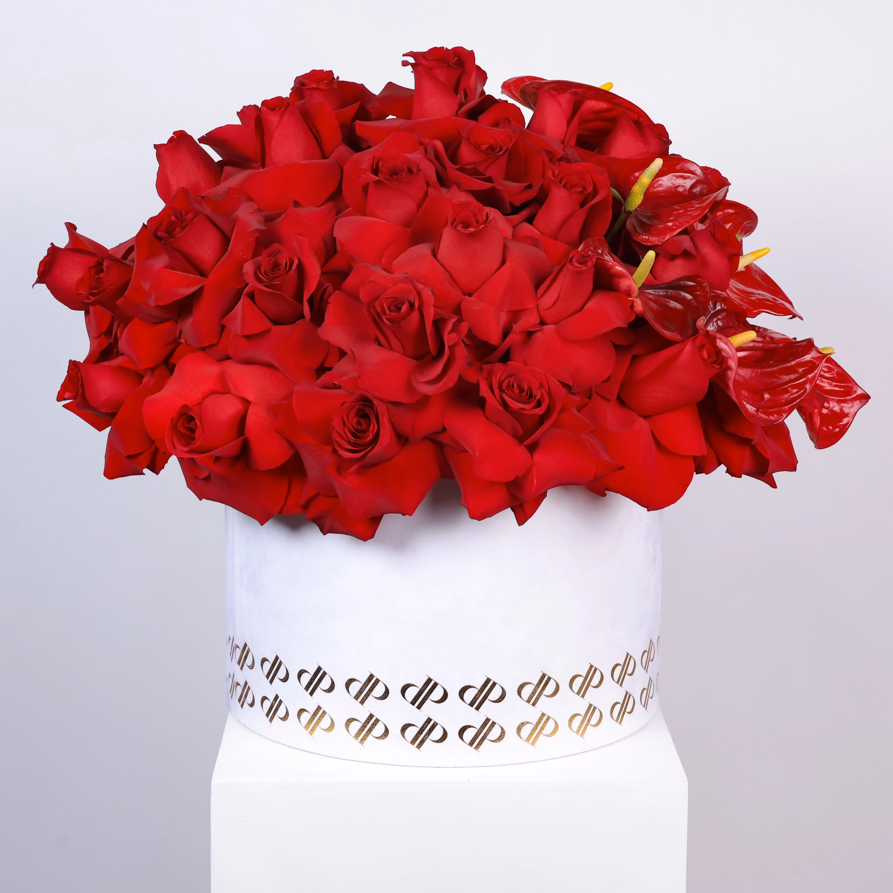 Red Royale is a luxurious floral composition combining roses with striking anthurium stems.