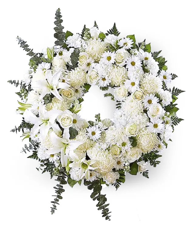 The Sincere Wreath is a timeless and elegant tribute to honor the memory of a loved one. This arrangement features a blend of white flowers, white lilies, eucalyptus, and chrysanthemums, along with some greeneries.