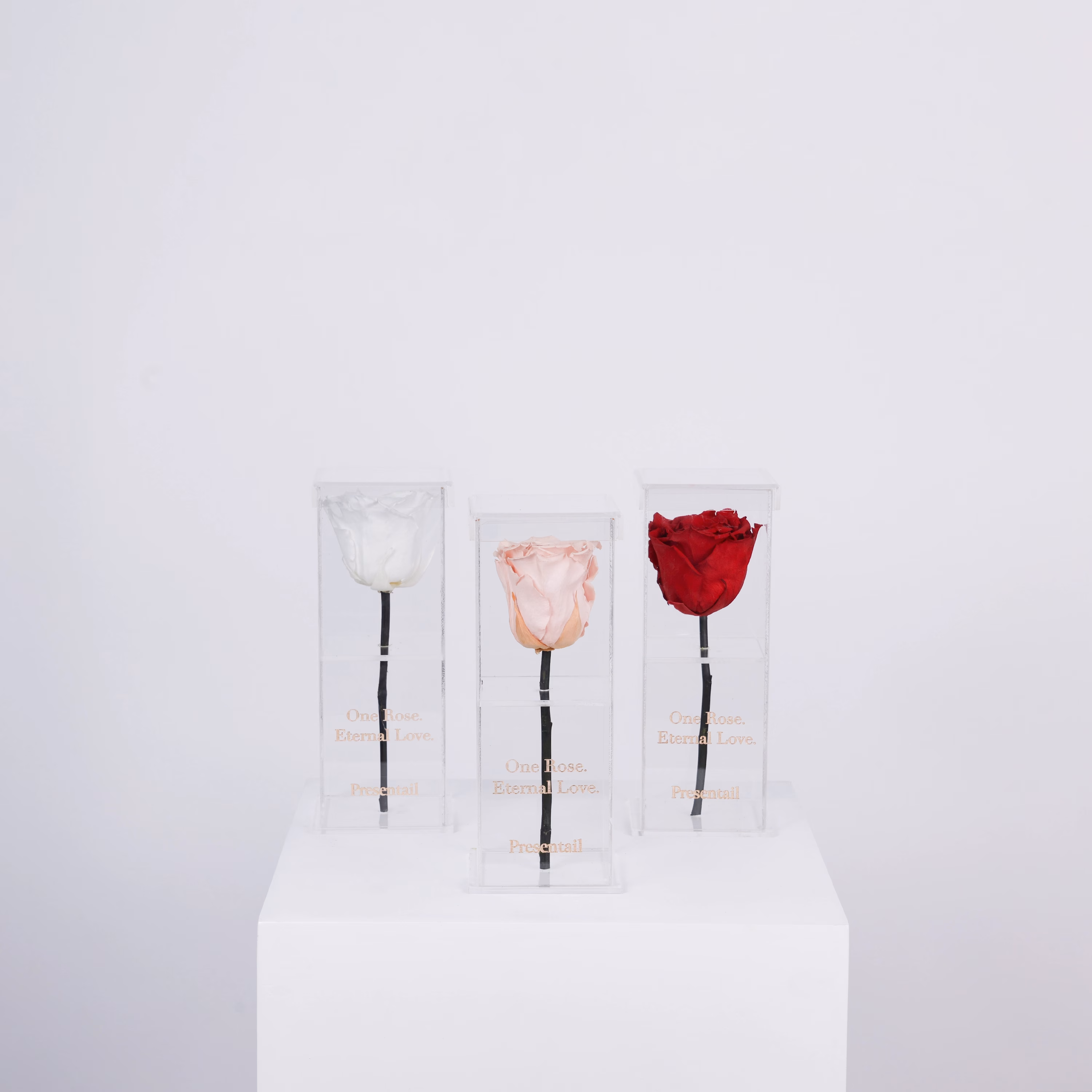 The Eternity Bundle is a luxurious trio of preserved roses symbolizing timeless love.