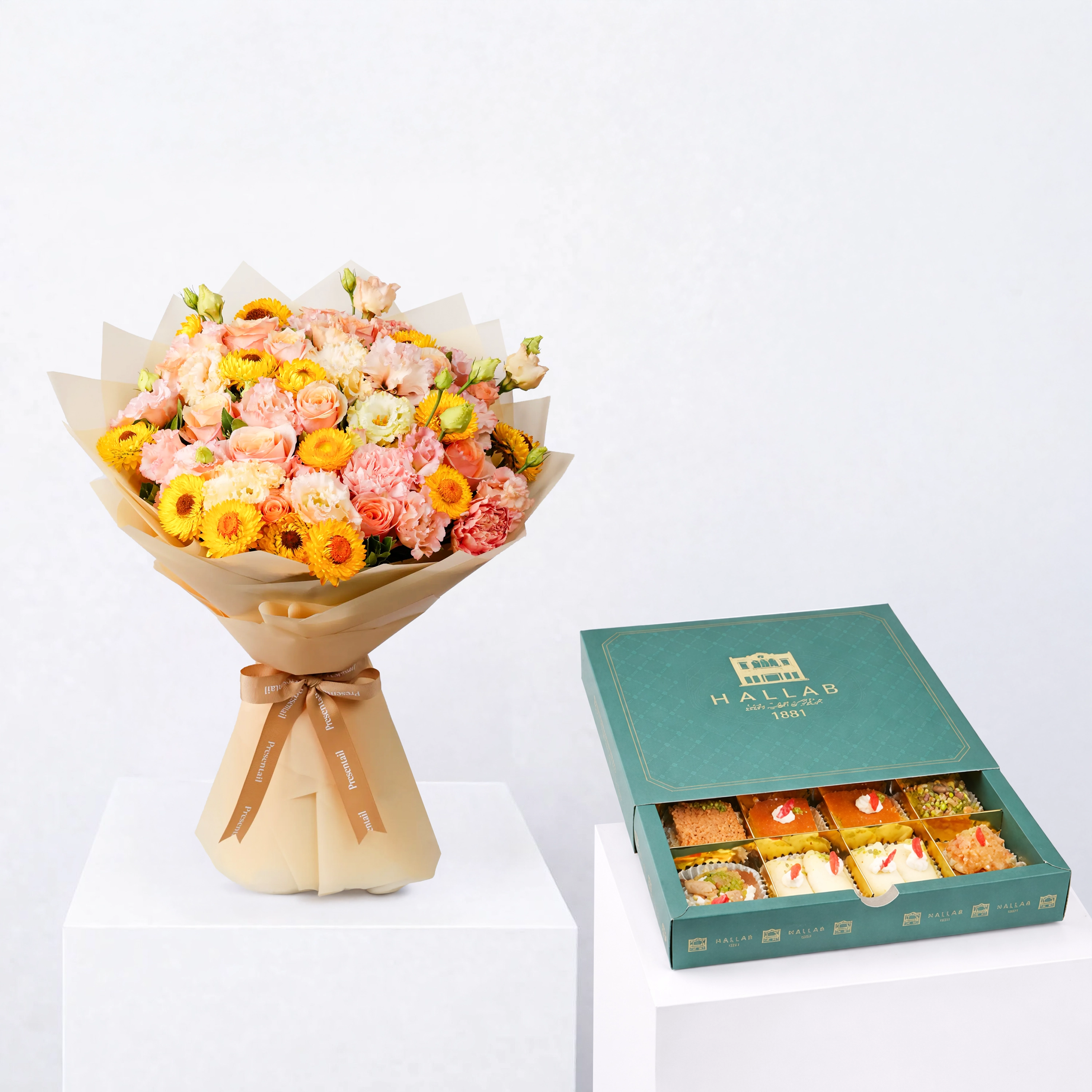 A beautifully curated floral and sweets bundle combining warm seasonal blooms with traditional delicacies for a thoughtful Ramadan gift.