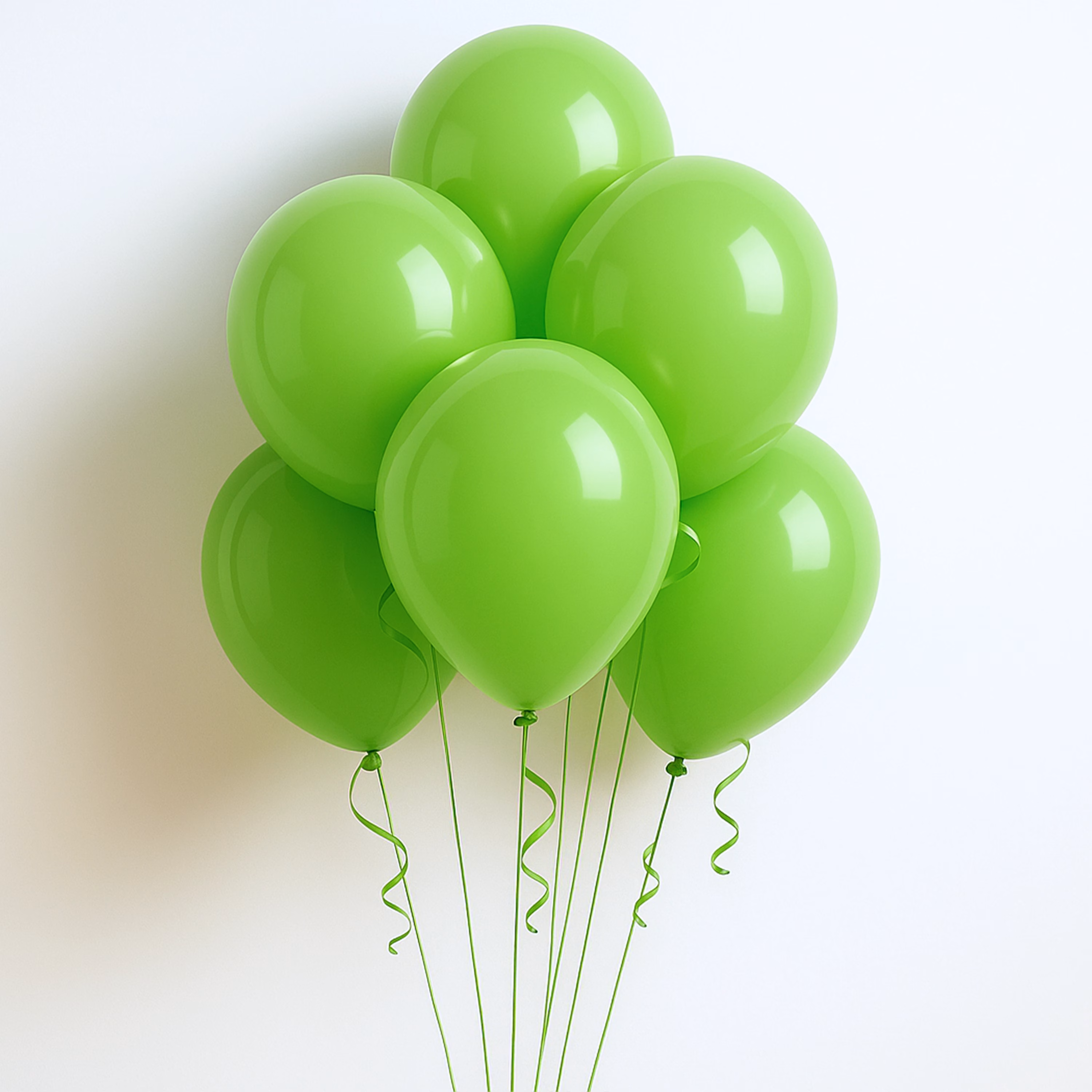 The Green balloon bouquet includes six, 11-inch, helium-filled, latex balloons tied to strings.