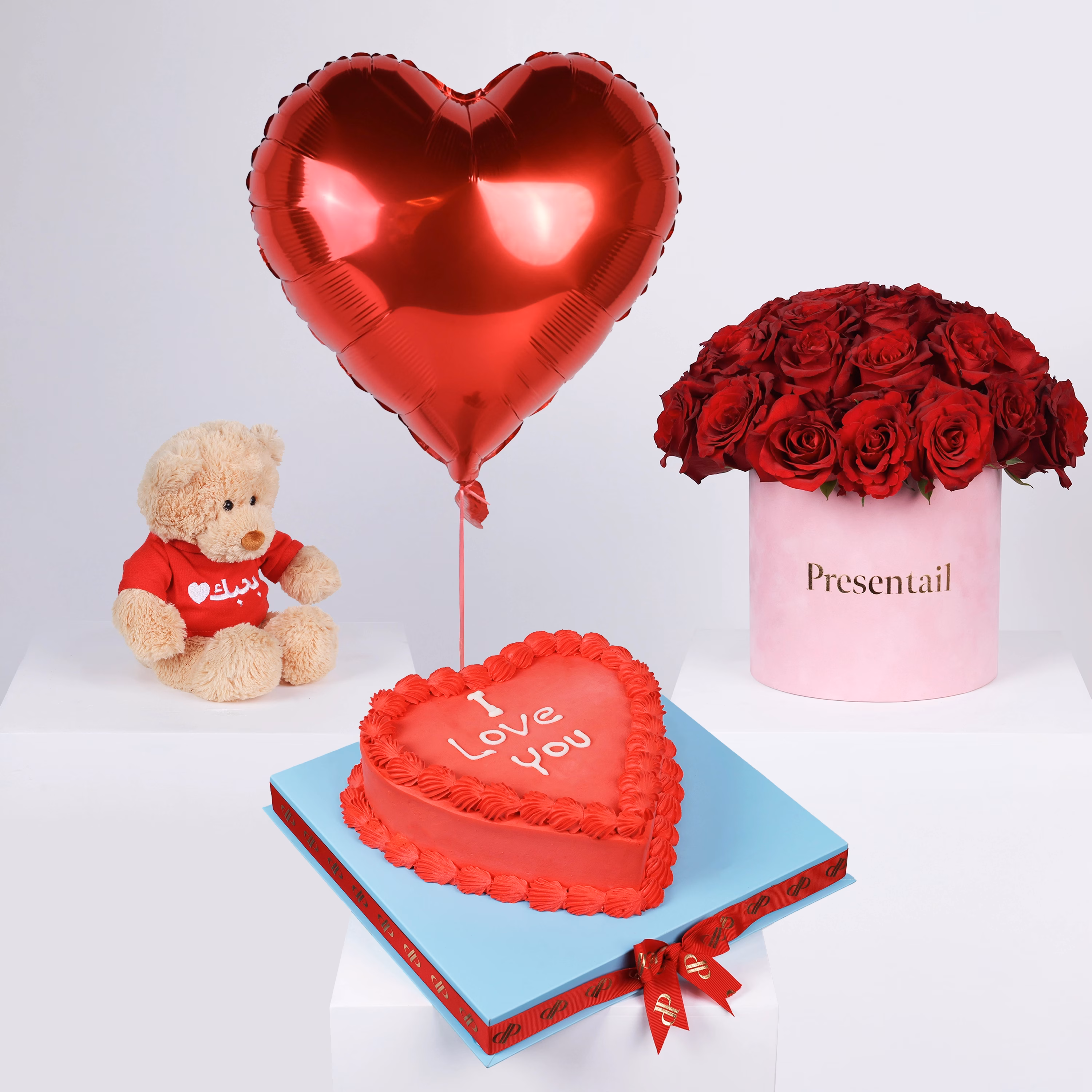 A bold Valentine’s bundle combining a cuddly keepsake, a heart balloon, a heart cake, and a luxurious velvet rose arrangement.