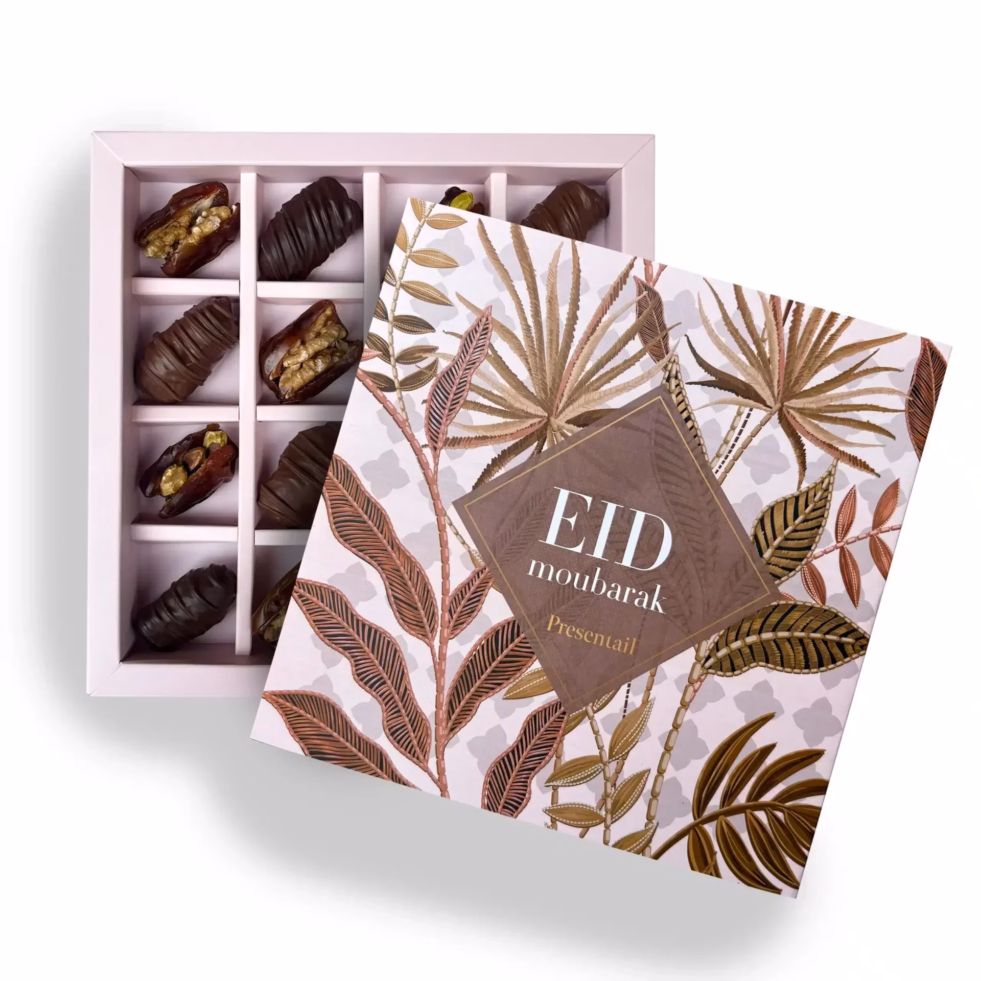 Celebrate this Eid by sending your loved ones this box of filled Dates. This box contains 16 dates, with a mix of fillings including chestnuts and pistachios, and some dipped in chocolate.