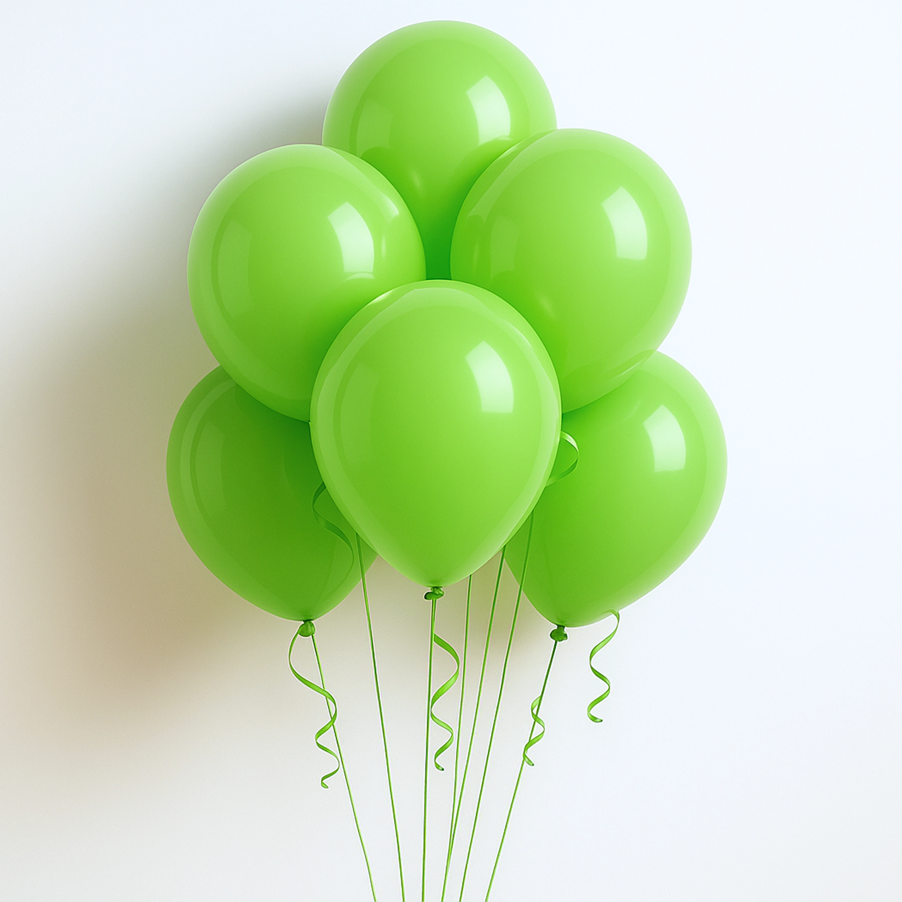 The Green balloon bouquet includes six, 11-inch, helium-filled, latex balloons tied to strings.