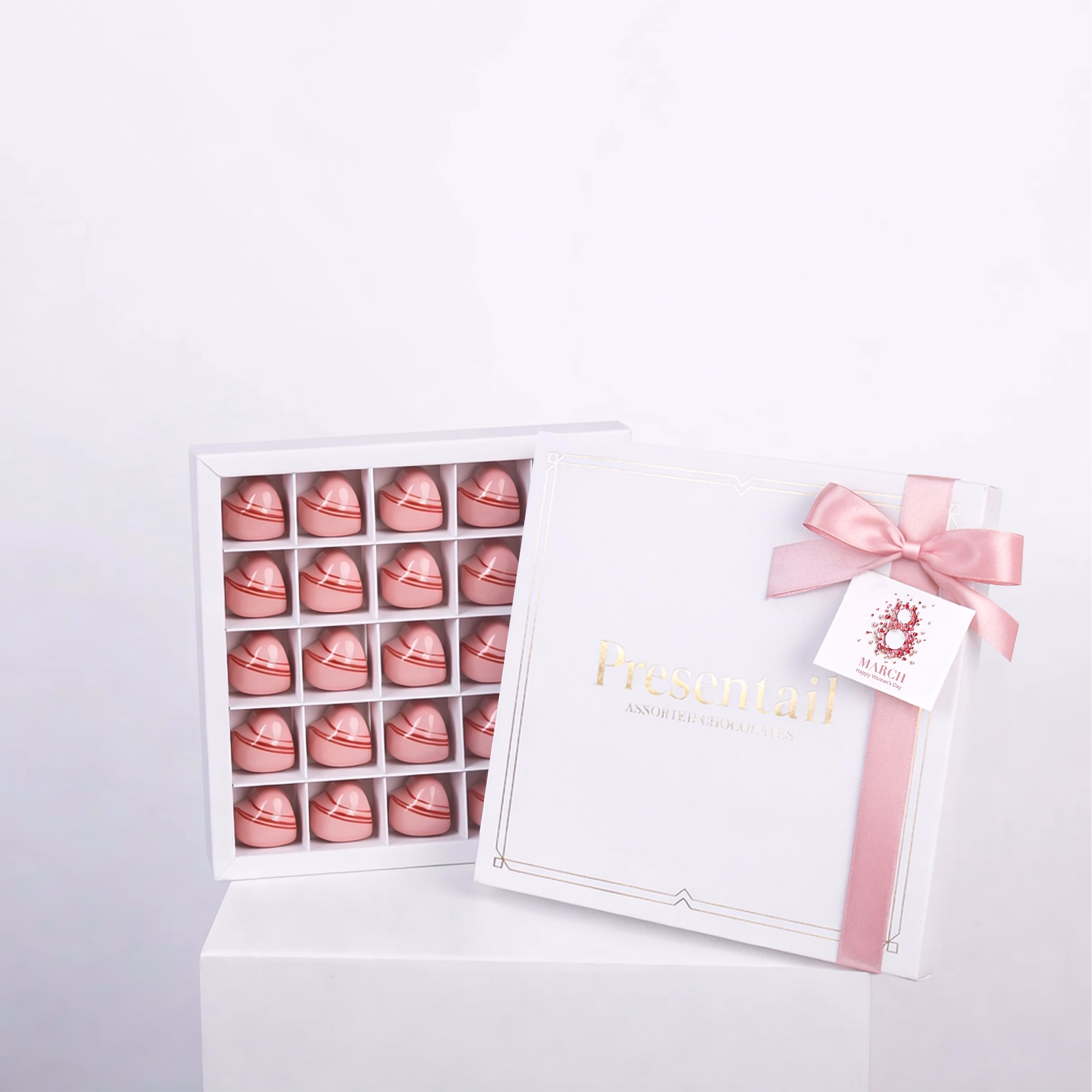 • 25 pink heart-shaped chocolates filled with raspberry ganache