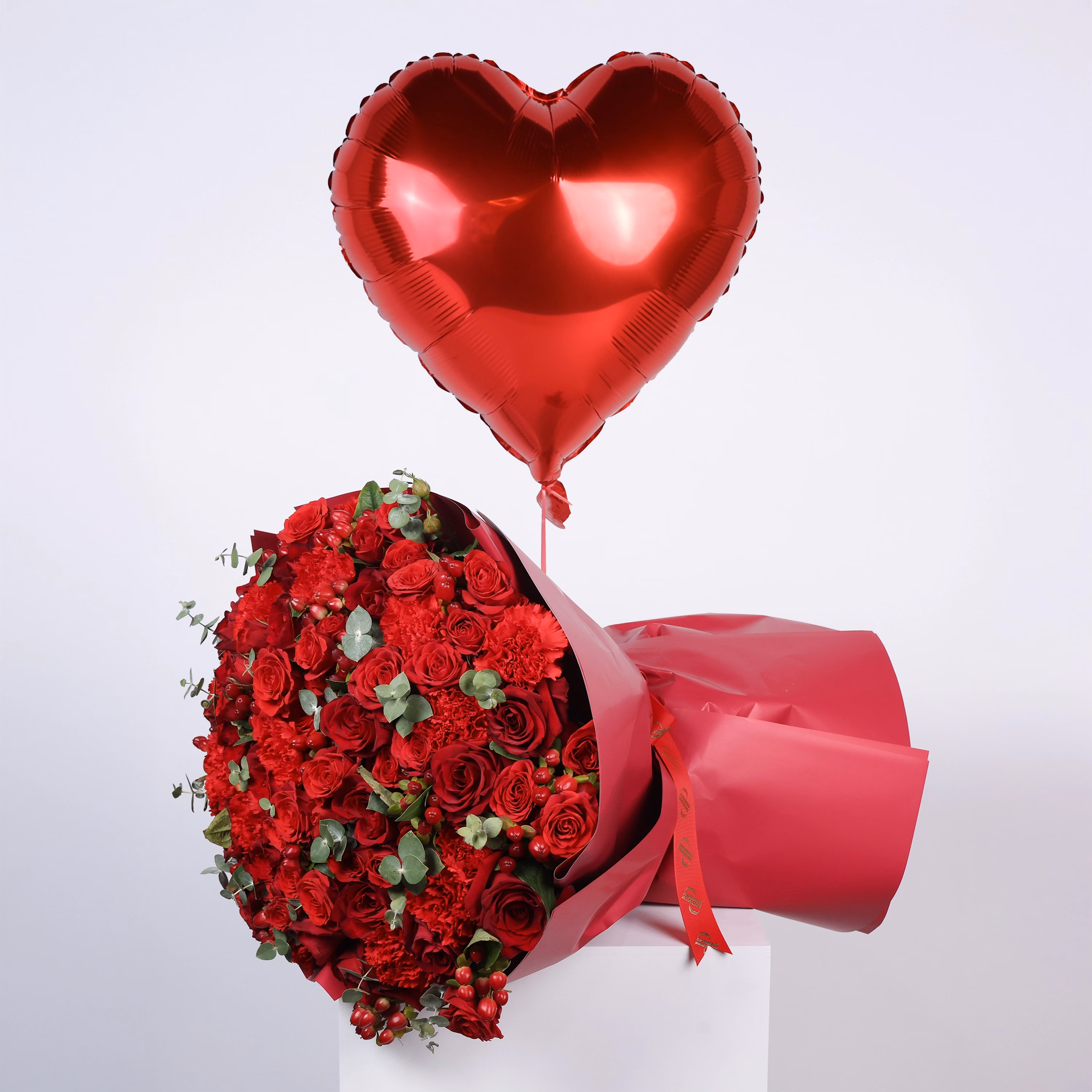 A modern Valentine’s bundle with a bold red balloon and a signature red-toned floral bag.