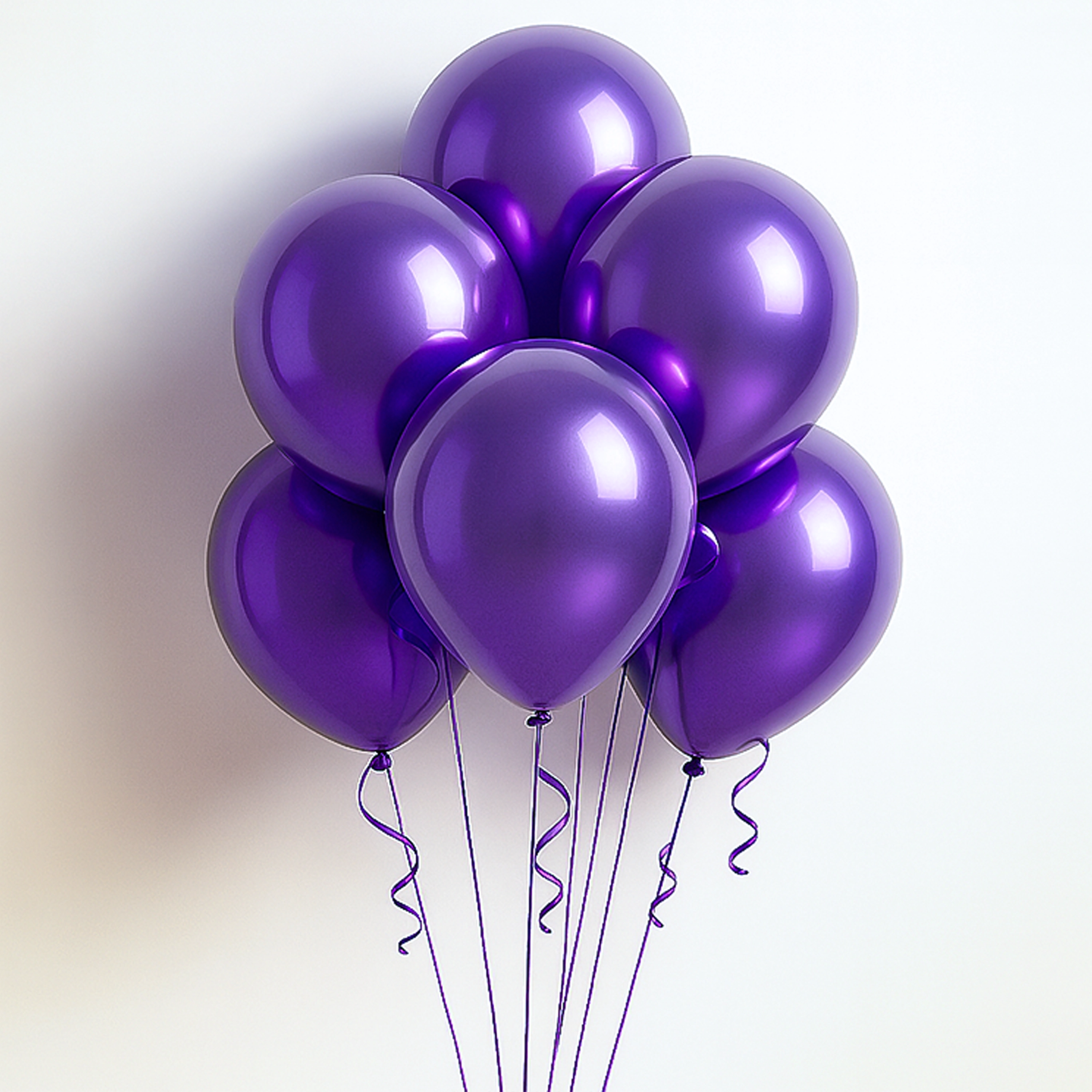 The purple chrome balloon bouquet includes six, 11-inch, helium-filled, latex balloons tied to strings.