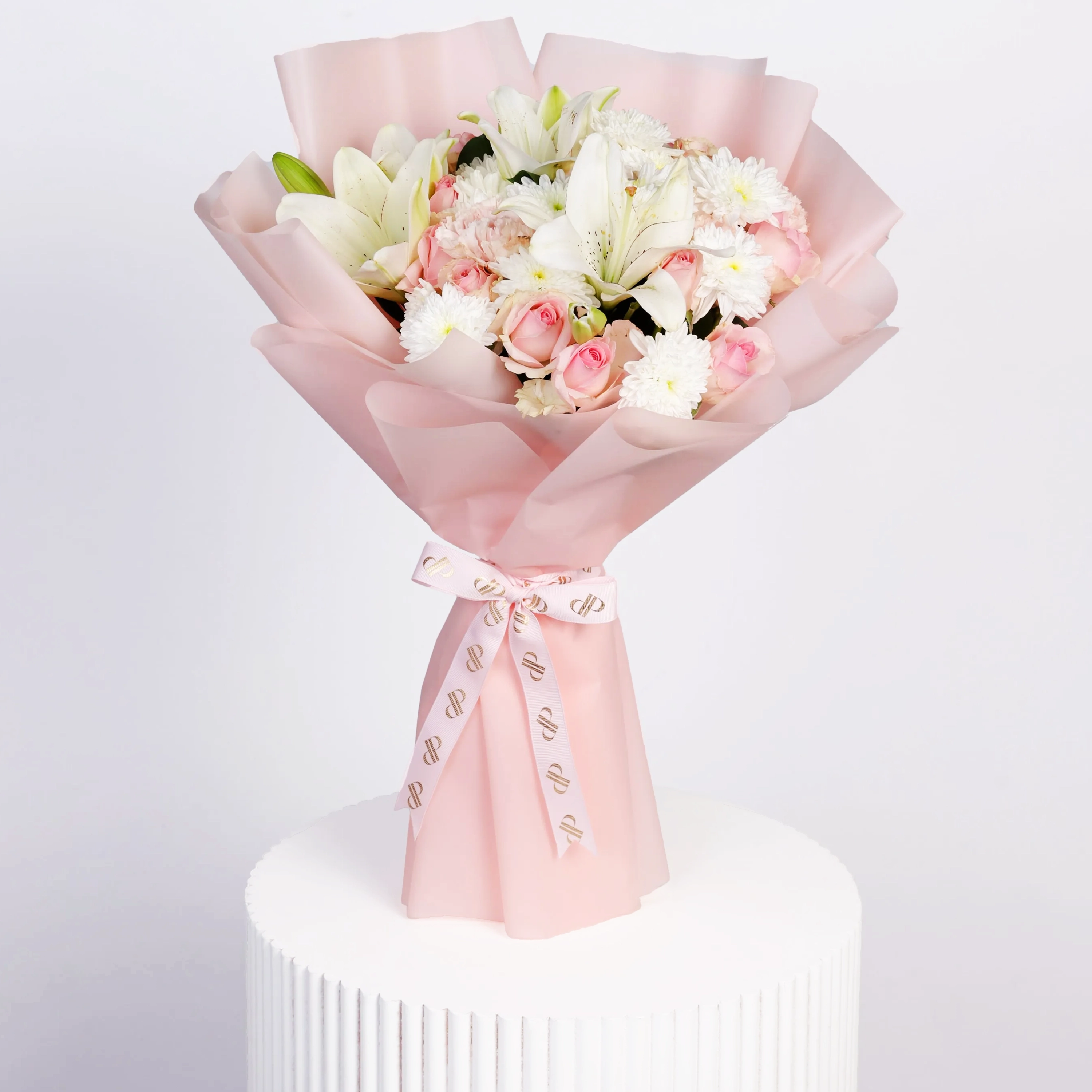 This bouquet includes 4 white lilies, white chrysanthemum, 8 pink roses, and pink carnations with pink wrapping paper.