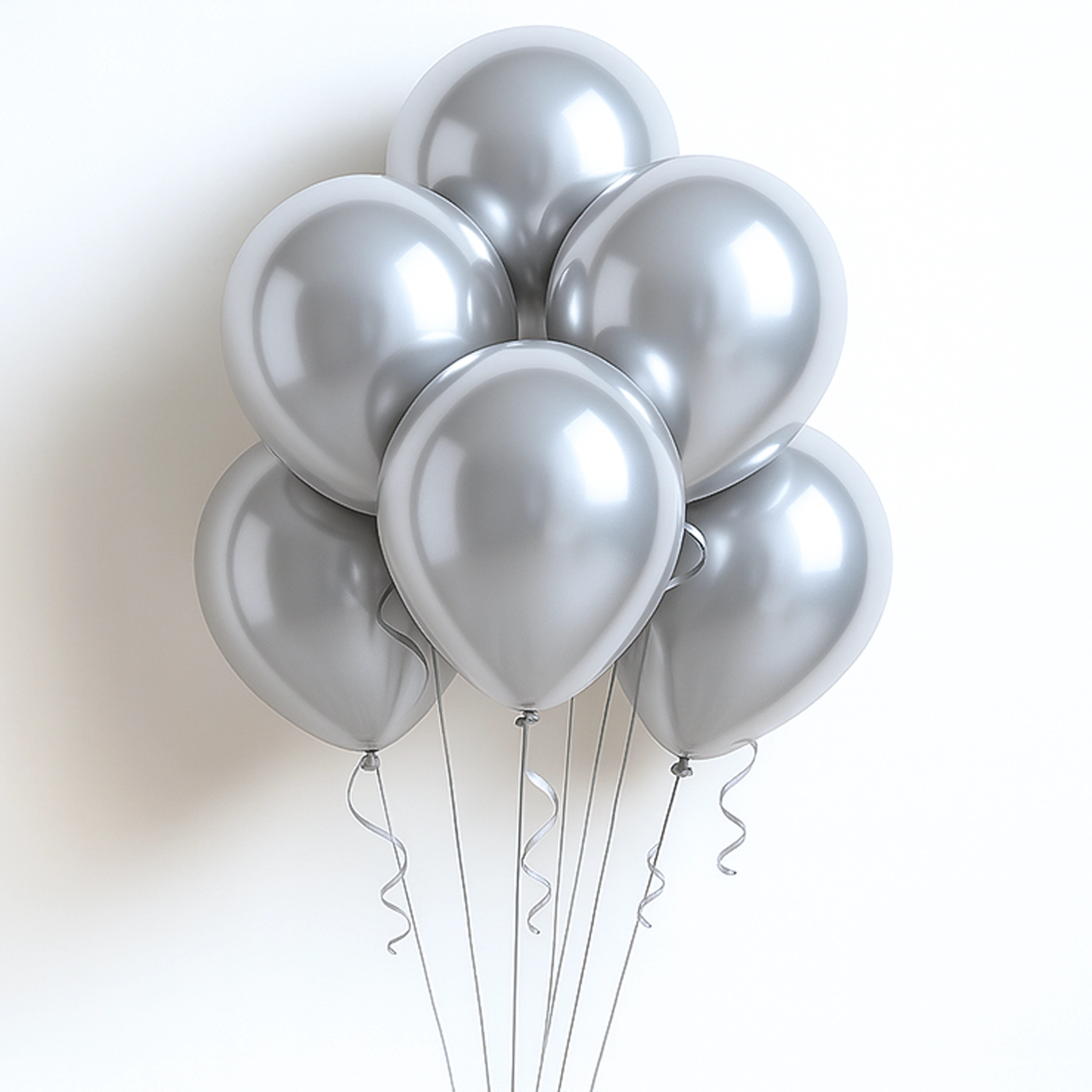 The silver chrome balloon bouquet includes six, 11-inch, helium-filled, latex balloons tied to strings.