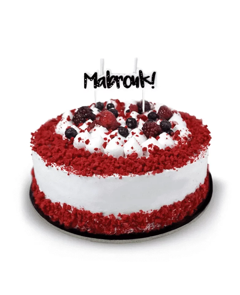كعكة مخملية حمراء مع شمعة مبروك، مصنوعة من طبقات محشوة ومغطاة بكريمة الجبن الكريمي. تكفي 10 أشخاص.