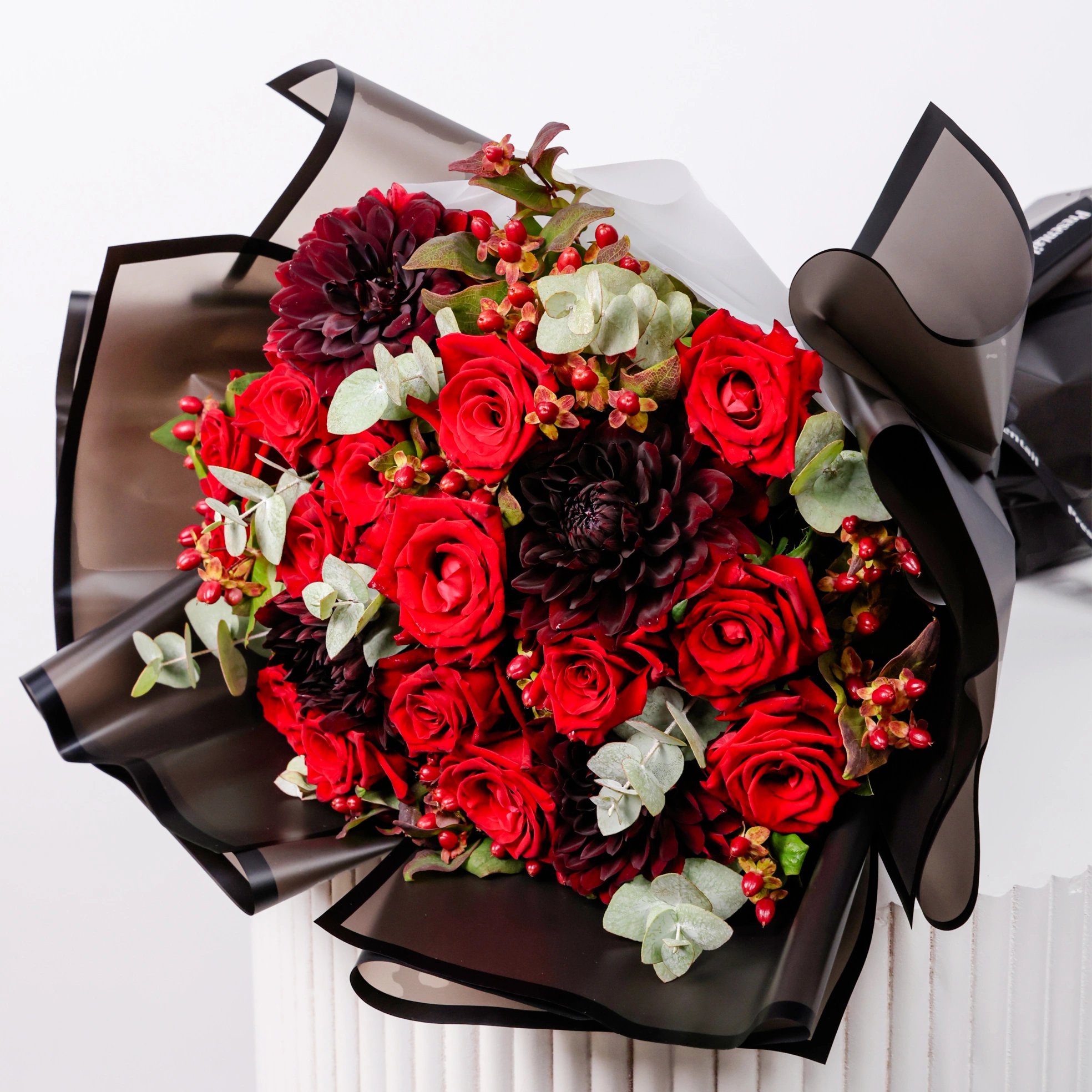 ماكسي روج هي باقة زهور يدوية مصنوعة من الورود الحمراء وأنواع أخرى من الزهور الحمراء والنباتات الخضراء. إرشادات العناية بالزهور: