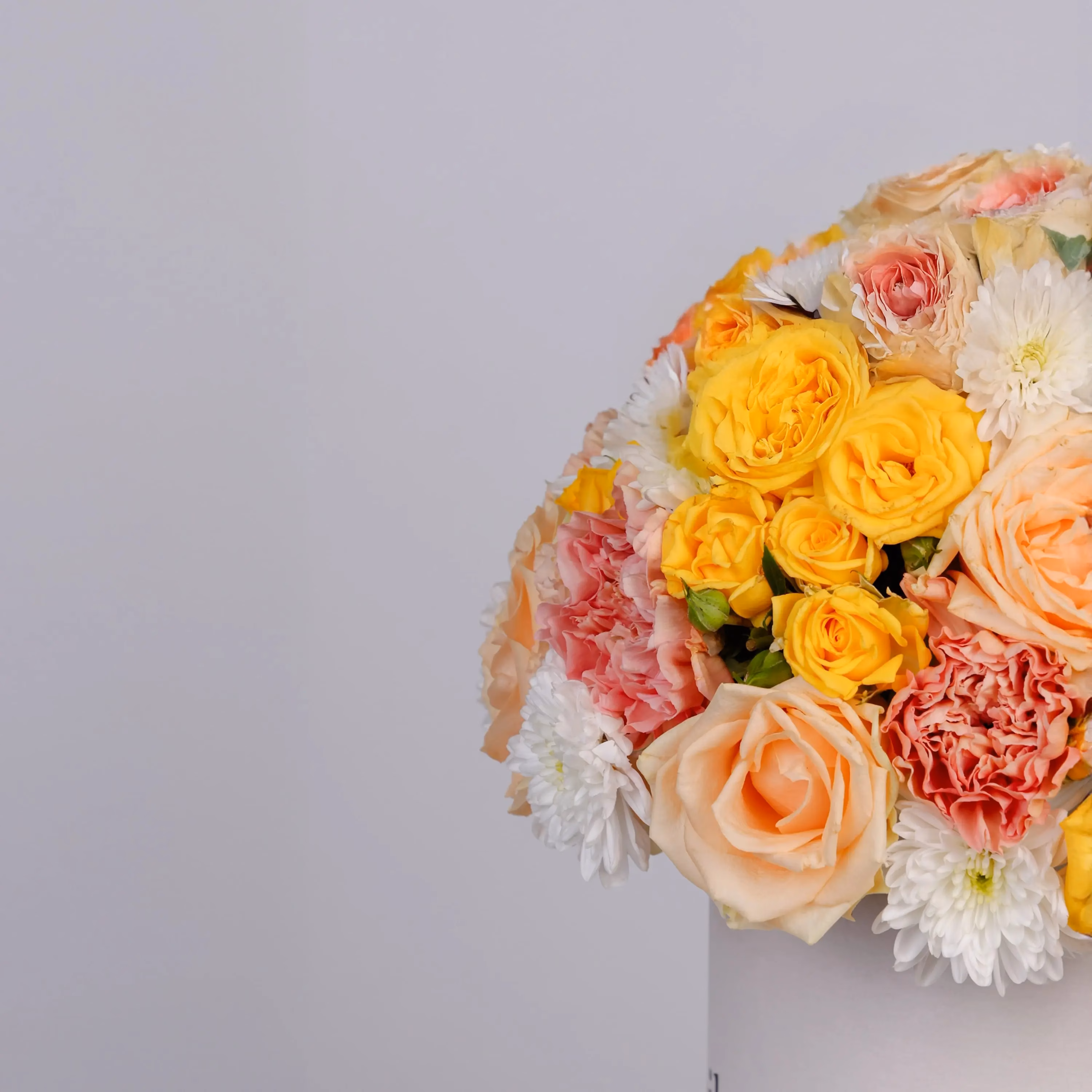 صندوق أوميغا عبارة عن صندوق زهور جديد مصنوع من ورود الخوخ والورود الحلوة والبابونج وغيرها.