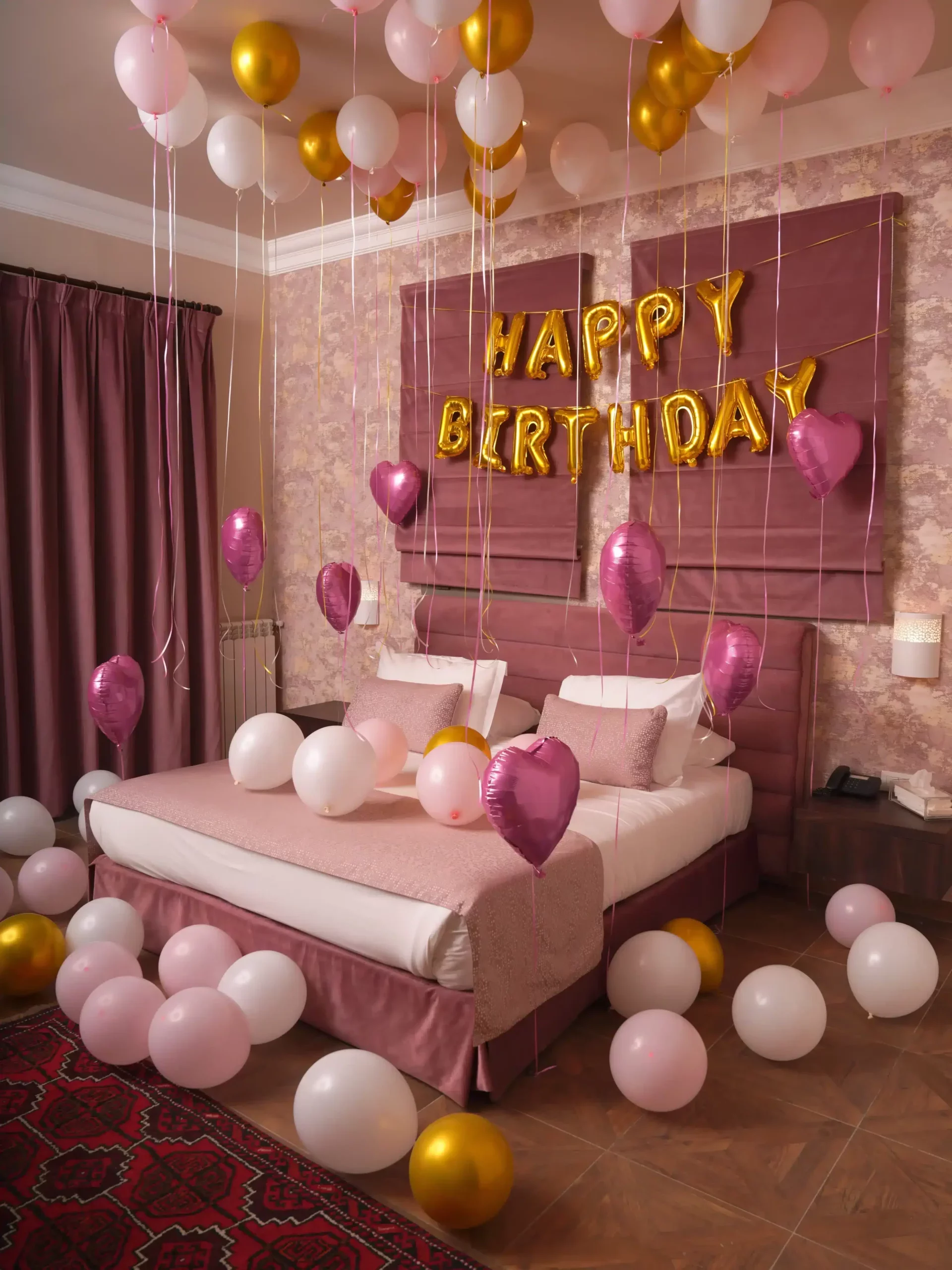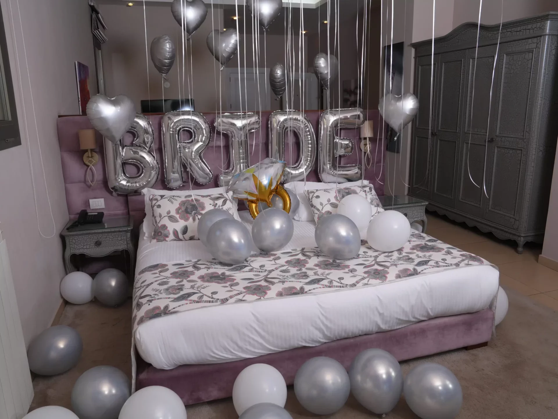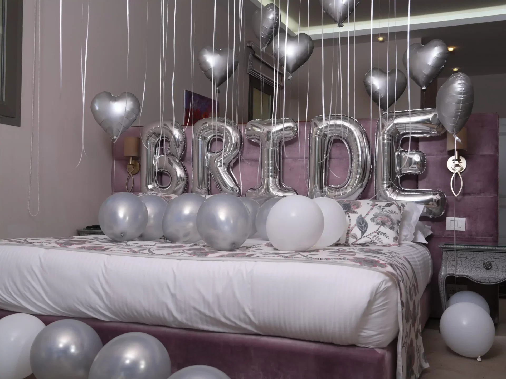 Celebrate her special day with a dreamy bridal setup that feels straight out of a fairytale. The room is styled in elegant white and gold tones, with clusters of helium balloons floating gracefully across the ceiling and cascading ribbons adding a touch of luxury. A stunning “Bride” balloon banner becomes the focal point.