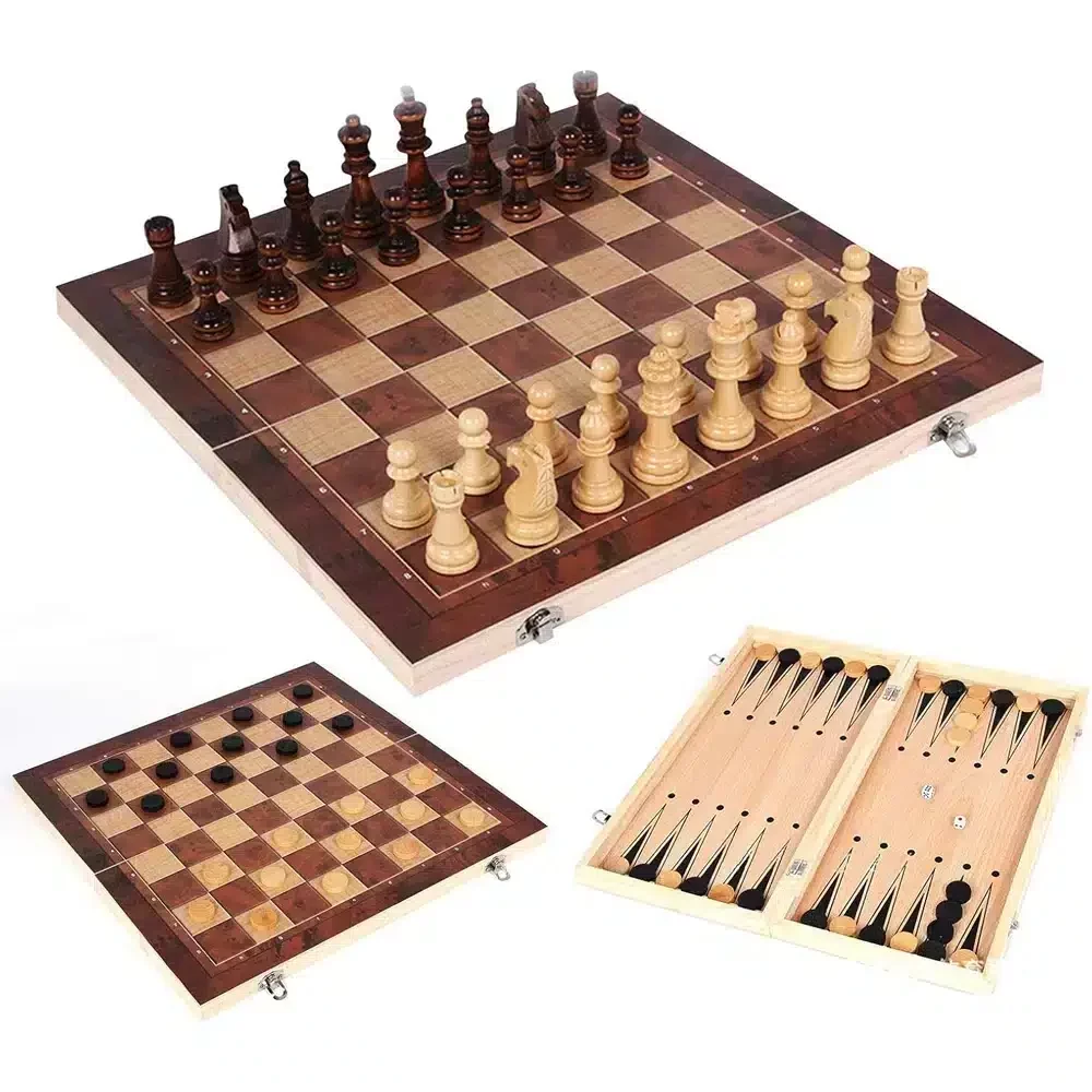 Perfect for players of all levels, it includes all chess pieces, checkers, and dice.