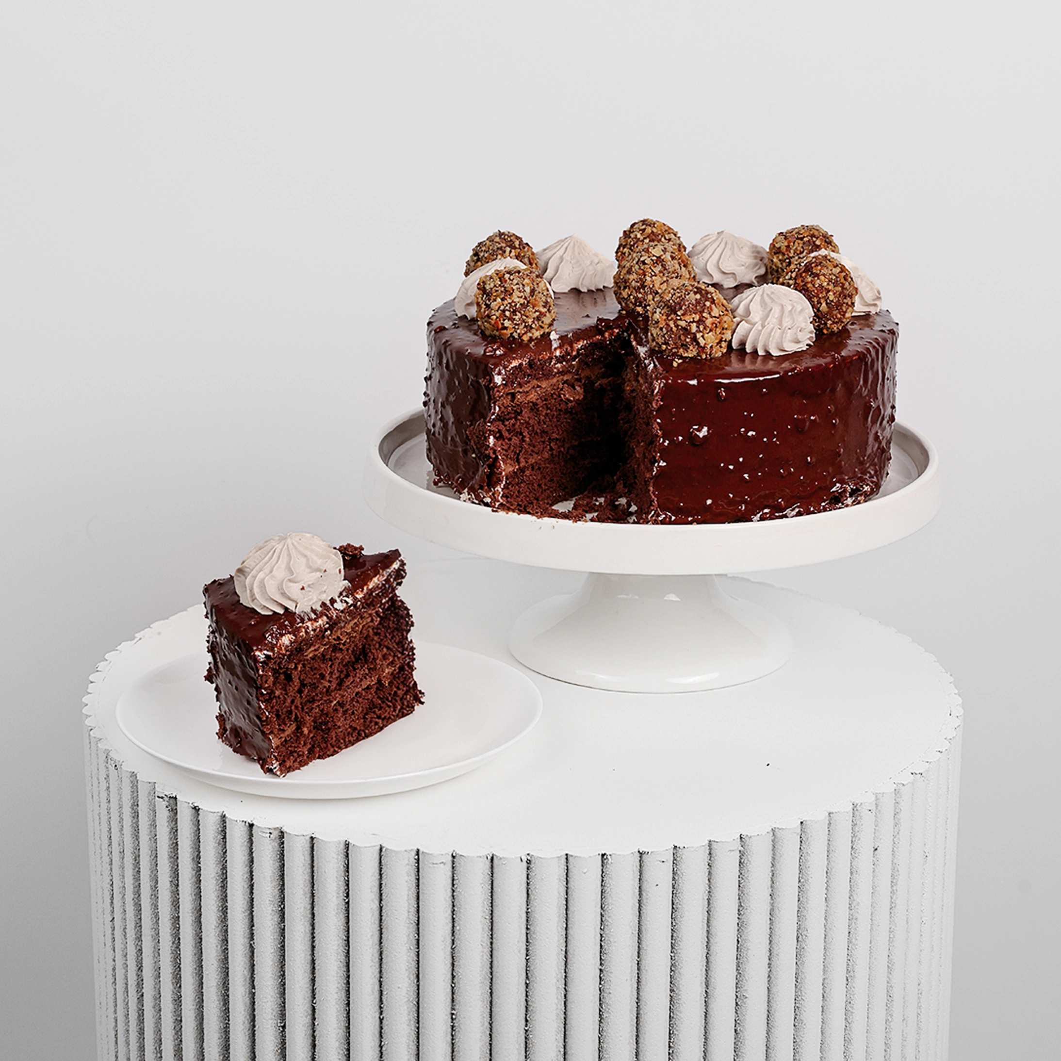 The Chocolate Rocher Cake is made of Chocolate spongy cake layers filled with chocolate cream, grinded hazelnut pieces, chocolate crisp and topped with chocolate glaze and Ferrero Rocher balls. Serves 10 people.