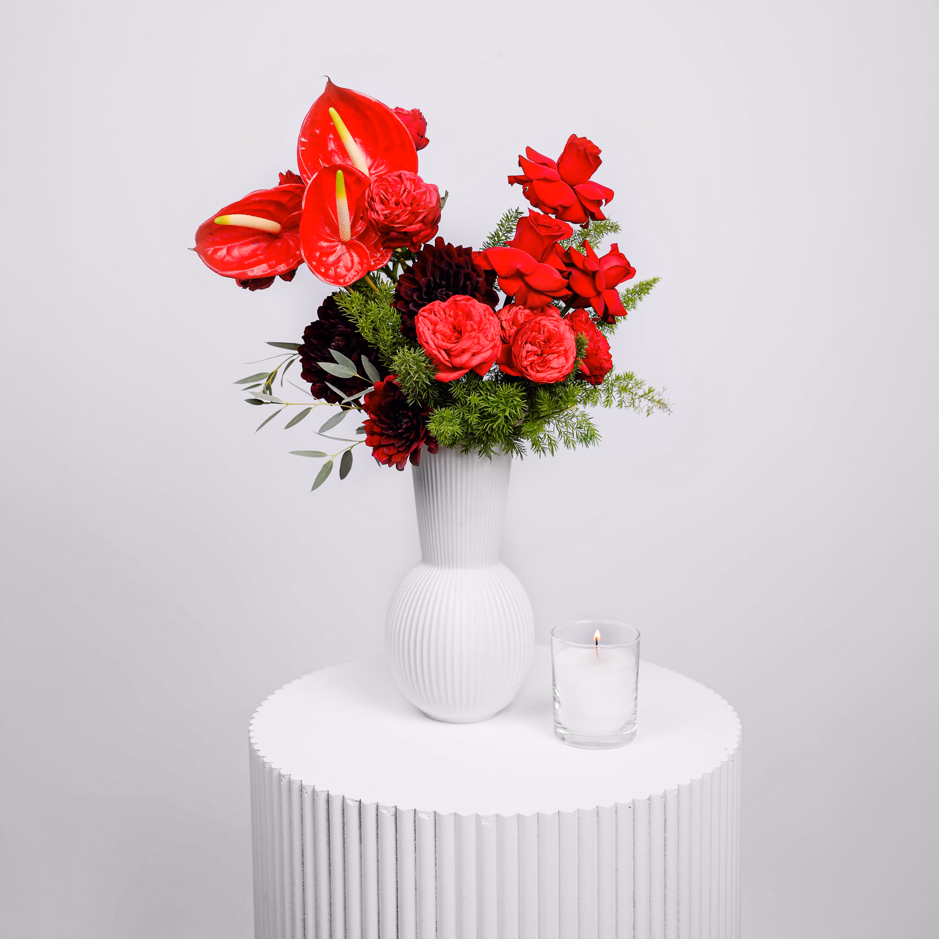 A passionate arrangement designed to embody love and allure. With its deep red tones and lush greenery, this bouquet radiates romance, intensity, and sensual charm—perfect for moments where passion speaks louder than words. Comes with one scented candle to spice up the mood, if this isn’t a long distance relationship of course.