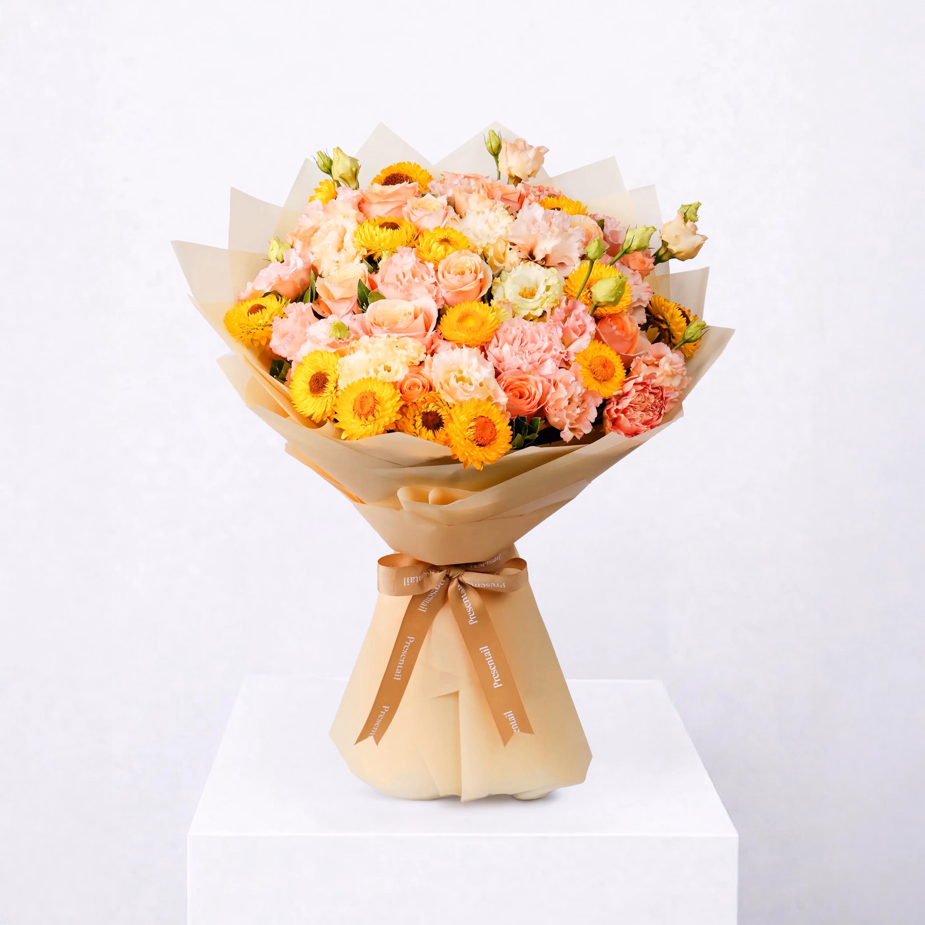 A radiant bouquet in warm peach and golden hues, beautifully balanced for a cheerful and refined look.