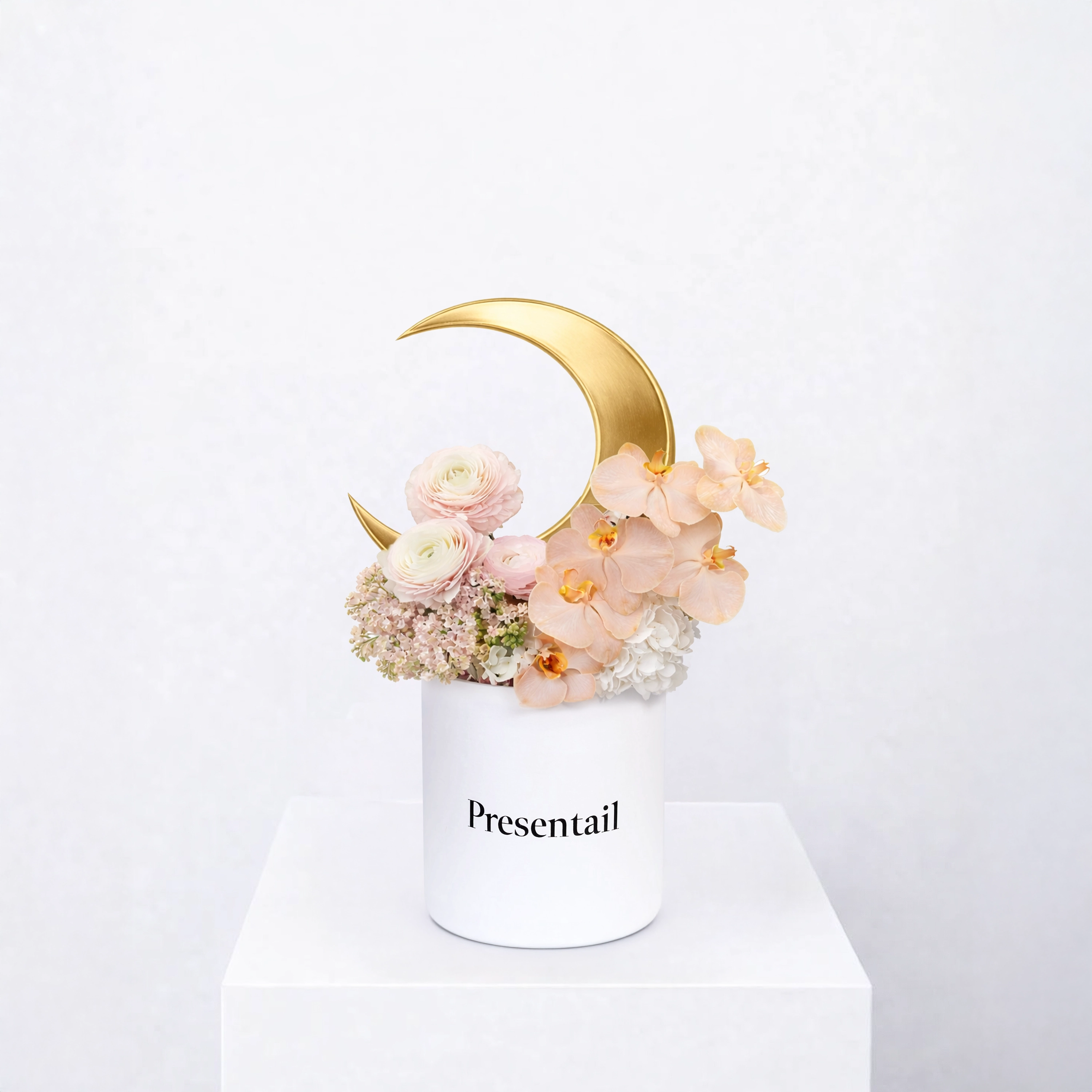 A compact and sophisticated flower box designed with a delicate golden crescent detail and soft romantic blooms.