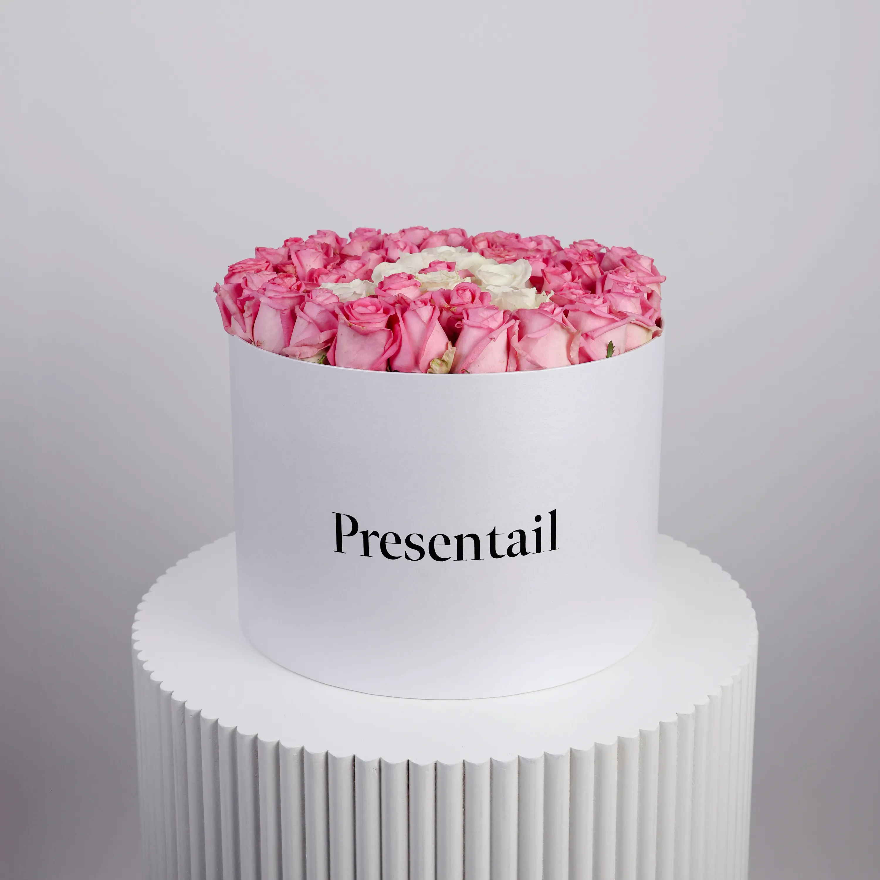 The Pink Letter Box is a romantic floral arrangement presented in an elegant round box.