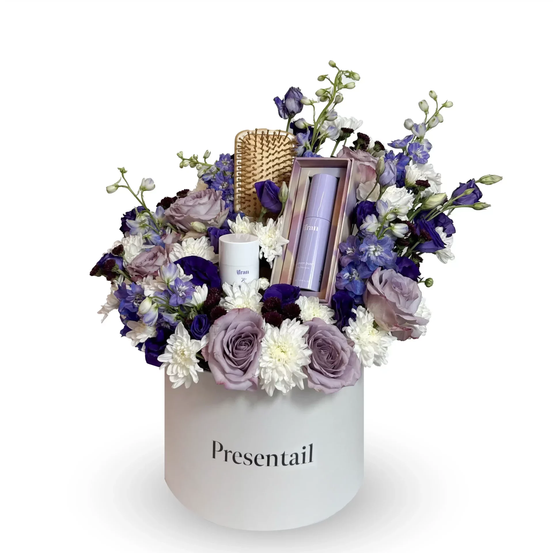 A quick & fresh beauty fix! This bundle includes Cloudy Dust Dry Shampoo, a Beeswax Stick, and a Bamboo Brush — paired with a vibrant mix of lilac roses, sweet pink baby roses, sunflowers, dried blooms, and pampas grass.
