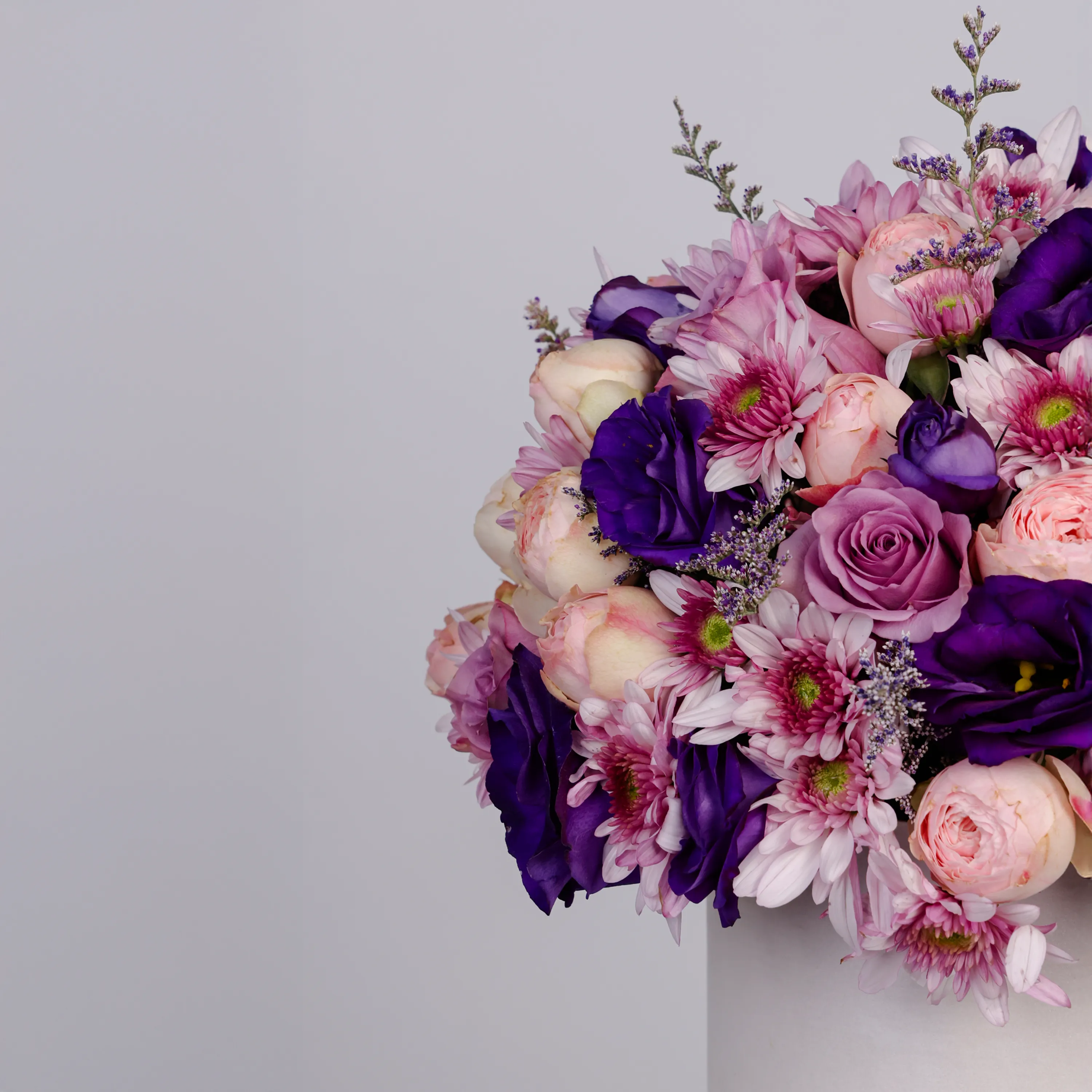 Our Super You Flower Box includes sweet pink roses, lila roses, purple chrysanthemums, and fresh ruscus leaves — a vibrant mix that celebrates you.